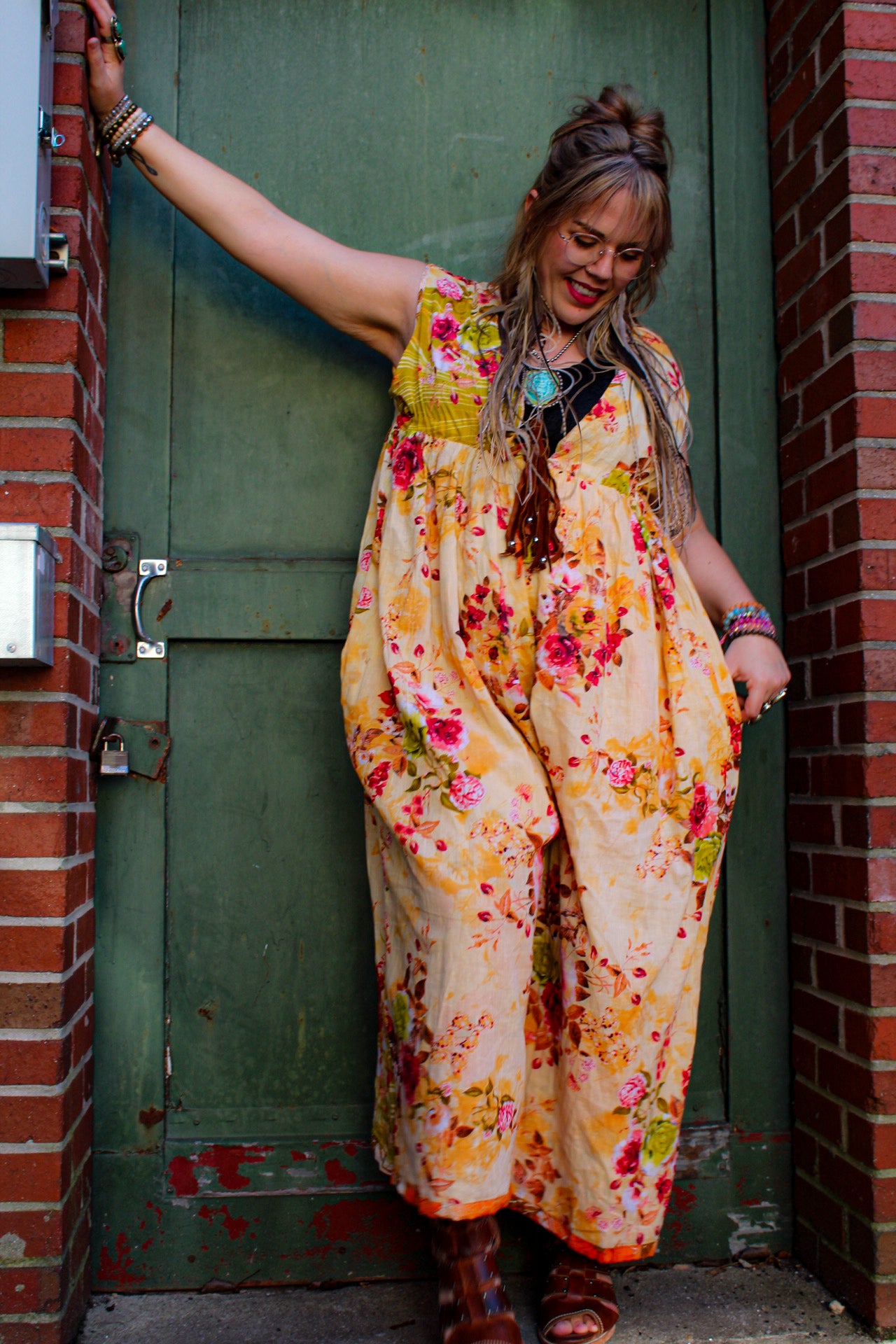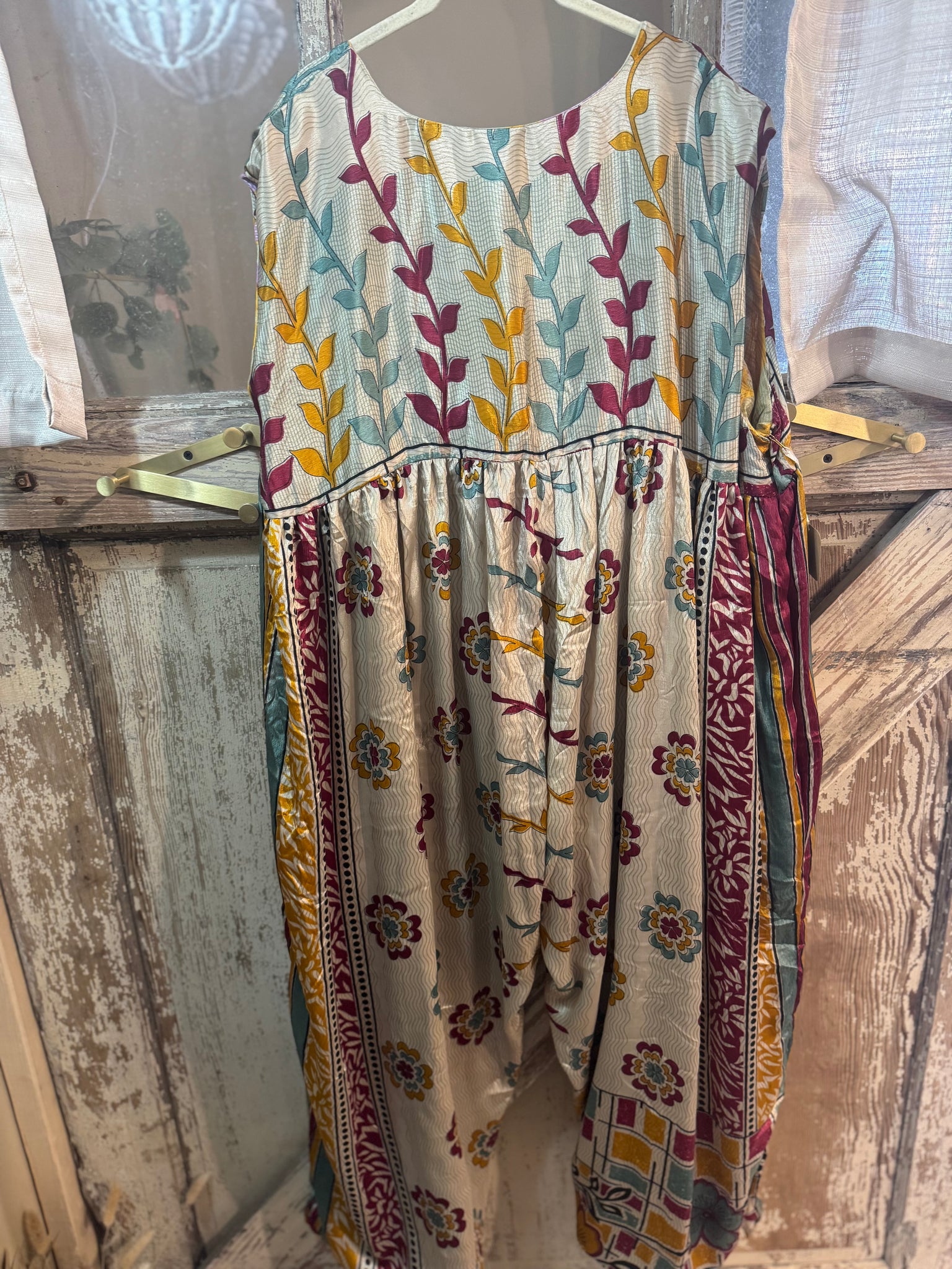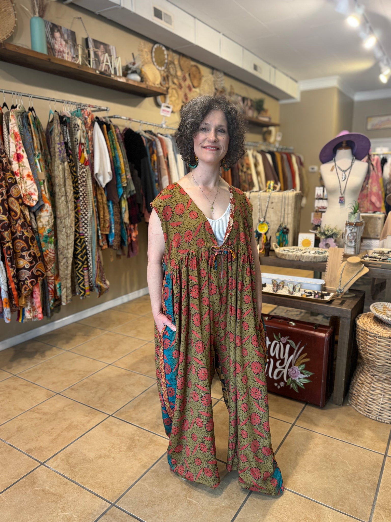 A fully lined, reversible jumpsuit. “ A “ side will be upcycled silk, and the “B” side with be a cotton. YES, 2/ in one! All one of a kind Upcycled prints. Both sides keep pockets, + keep tie functional waist tie. Free size is going to work for up to 16/18 If youre taller than 5’5, this jumpsuit crotch might be too short for you. I am size 14, 5’8 in the jumpsuit. (Crystal)