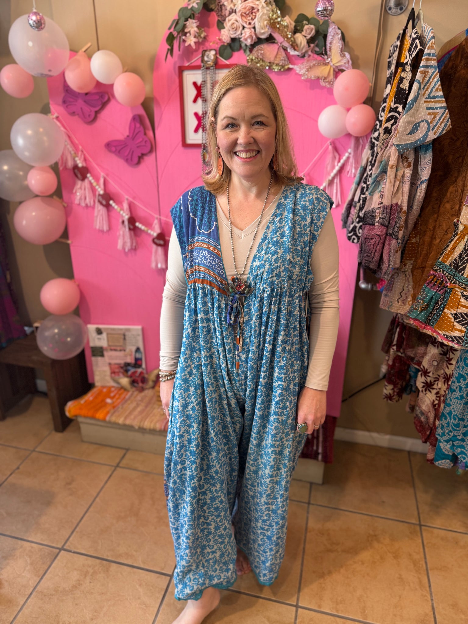 Tammy is size 7/8 5’4 in the jumpsuit. (Blue)