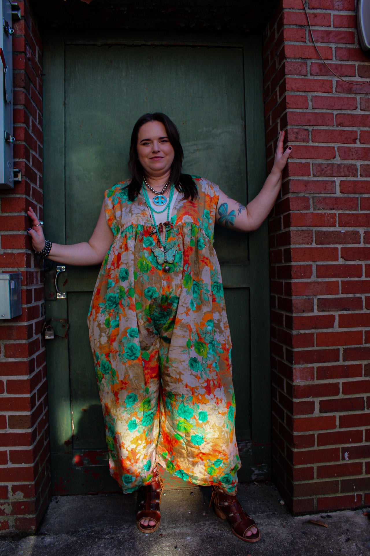 Lauren is size 14 5’3 in the jumpsuit. (green + Orange)