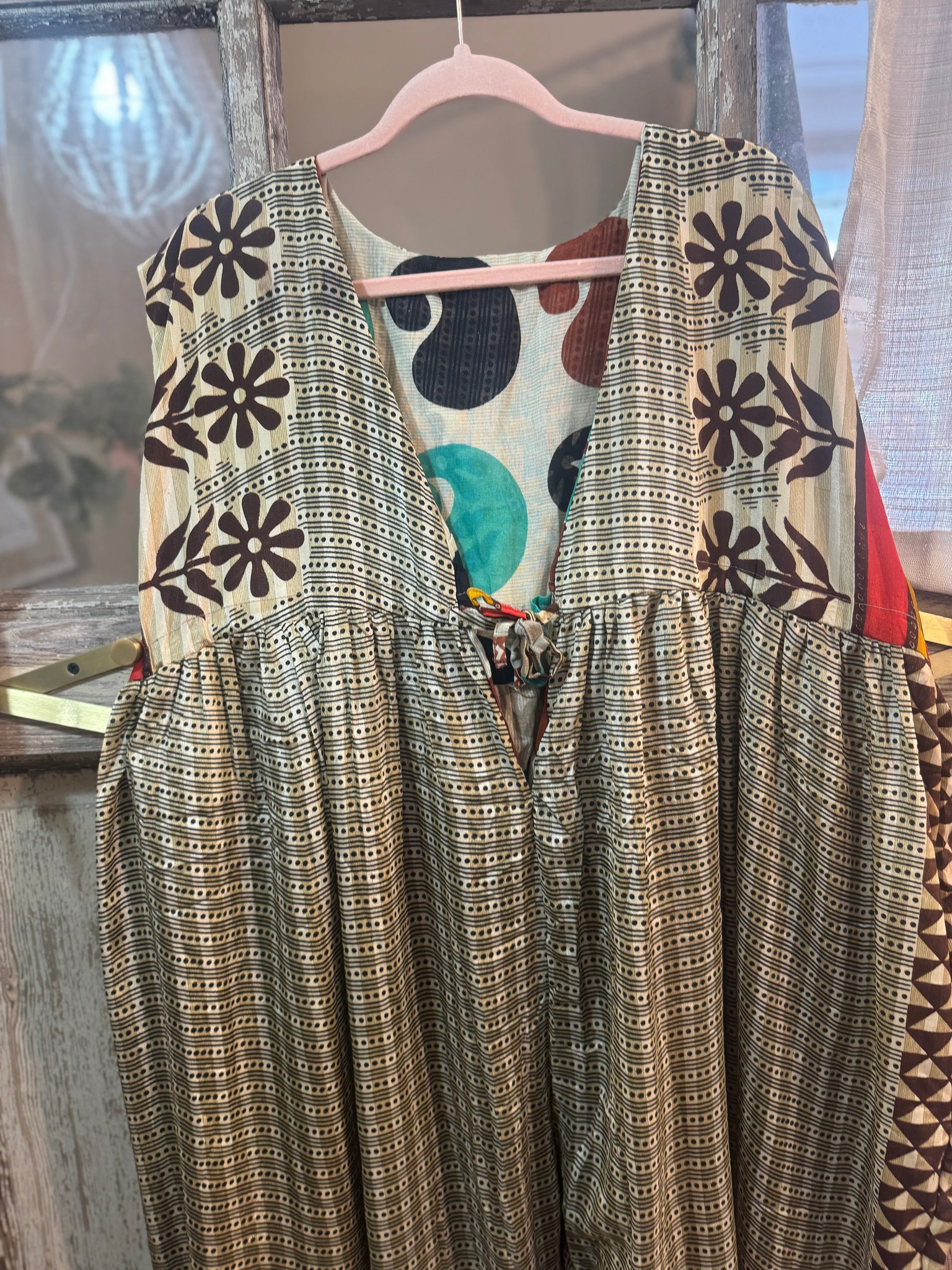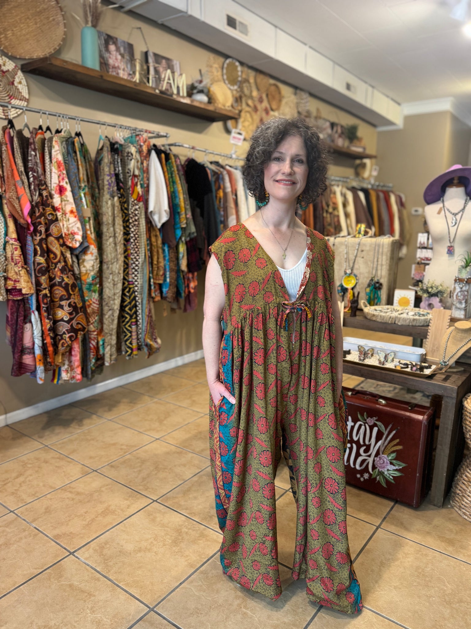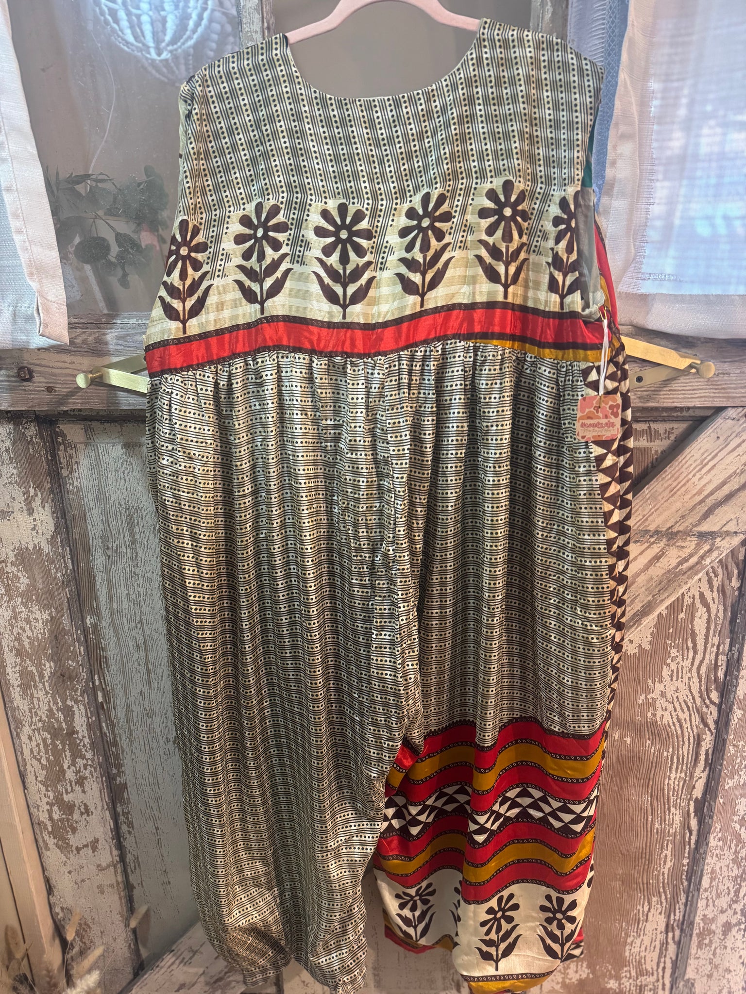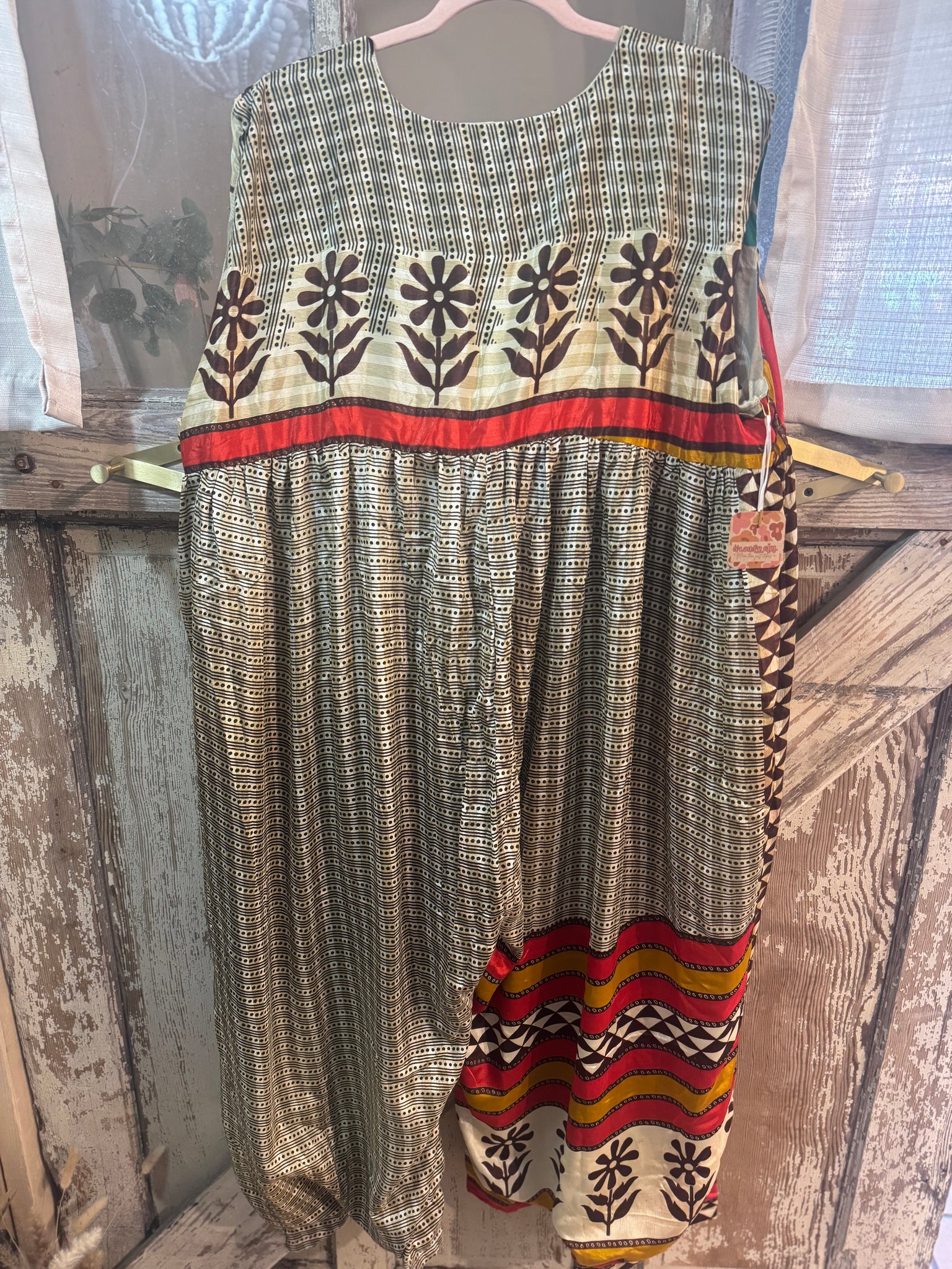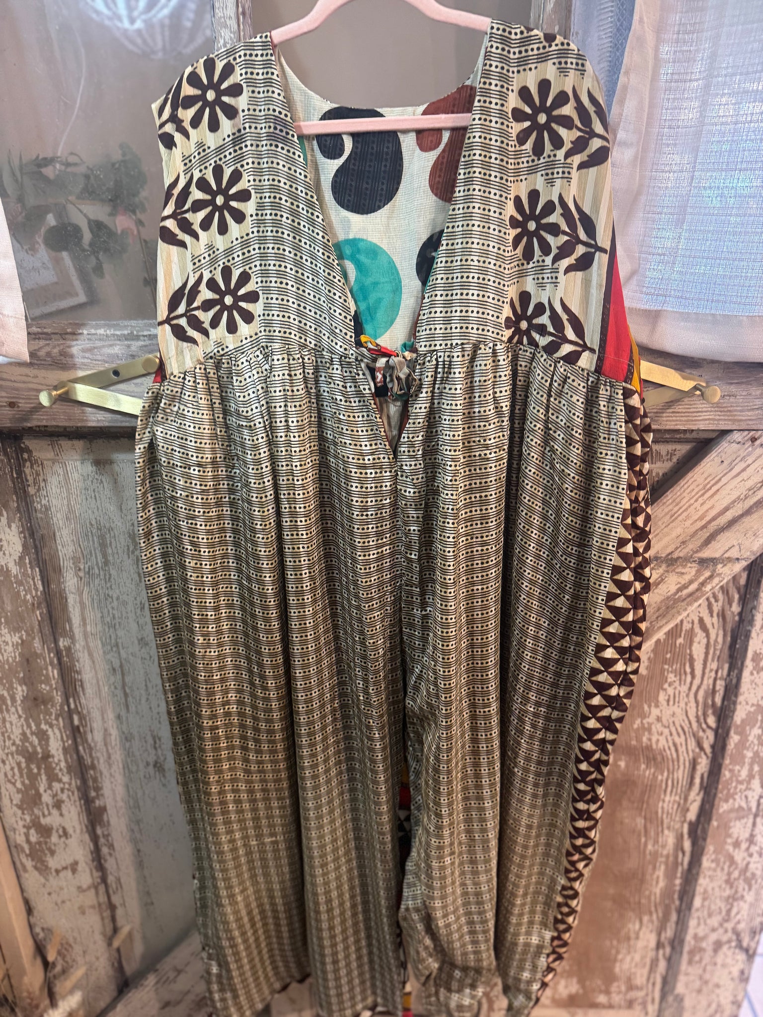 A fully lined, reversible jumpsuit. “ A “ side will be upcycled silk, and the “B” side with be a cotton. YES, 2/ in one! All one of a kind Upcycled prints. Both sides keep pockets, + keep tie functional waist tie. Free size is going to work for up to 16/18 If youre taller than 5’5, this jumpsuit crotch might be too short for you. I am size 14, 5’8 in the jumpsuit. (Crystal)