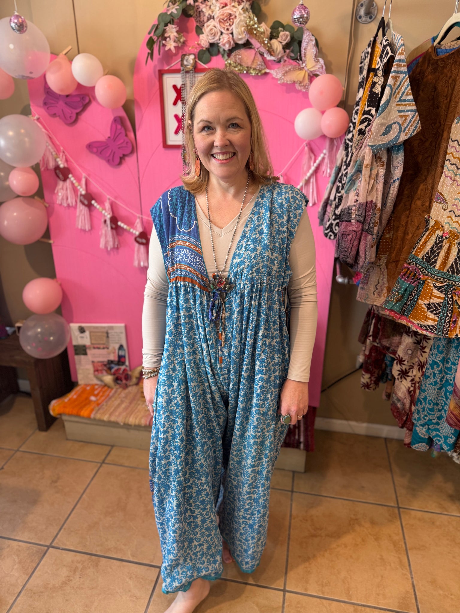 A fully lined, reversible jumpsuit. “ A “ side will be upcycled silk, and the “B” side with be a cotton. YES, 2/ in one! All one of a kind Upcycled prints.  Both sides keep pockets, + keep tie functional waist tie. Free size is going to work for up to 16/18 If youre taller than 5’5, this jumpsuit crotch might be too short for you. I am size 14, 5’8 in the jumpsuit. (Crystal)