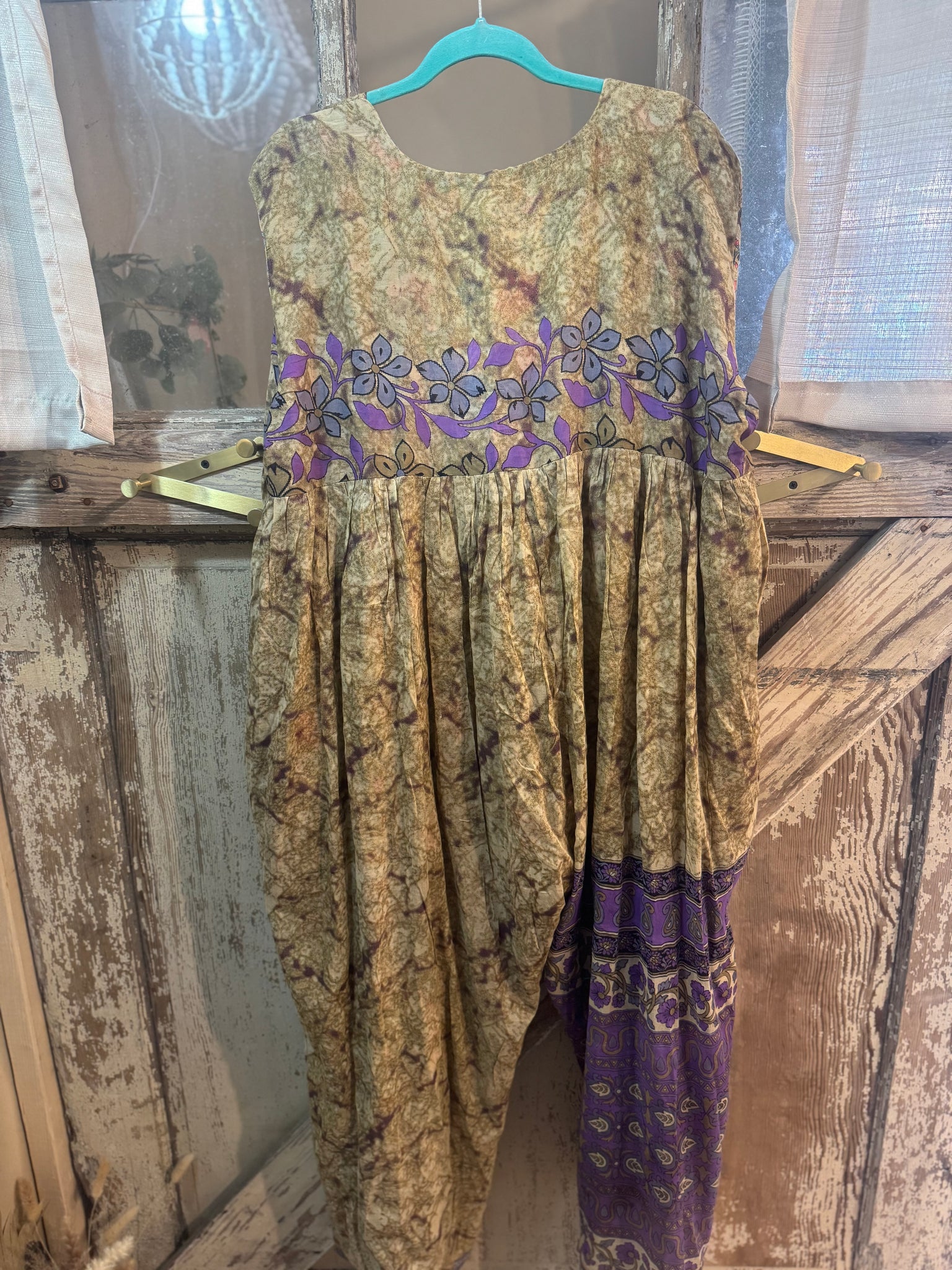 A fully lined, reversible jumpsuit. “ A “ side will be upcycled silk, and the “B” side with be a cotton. YES, 2/ in one! All one of a kind Upcycled prints.  Both sides keep pockets, + keep tie functional waist tie. Free size is going to work for up to 16/18 If youre taller than 5’5, this jumpsuit crotch might be too short for you. I am size 14, 5’8 in the jumpsuit. (Crystal)