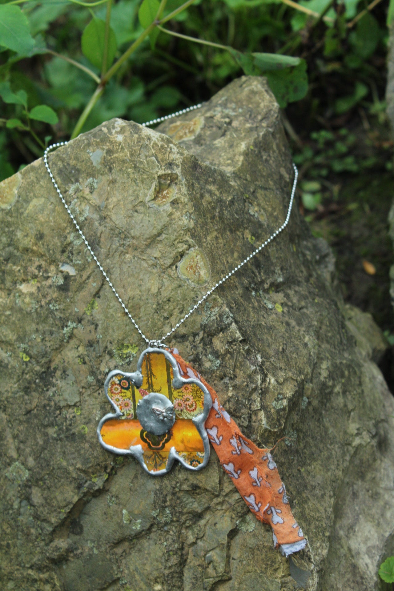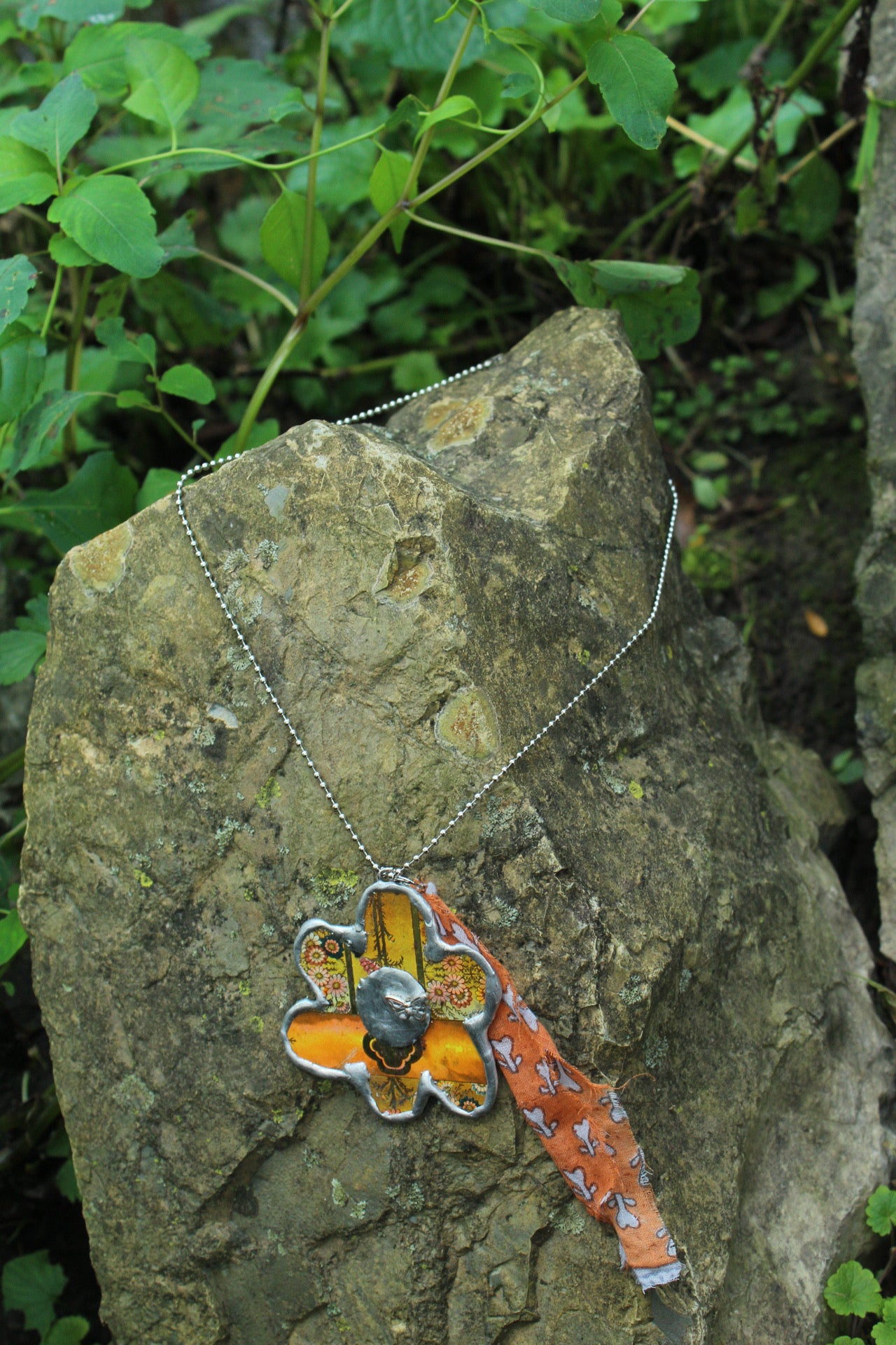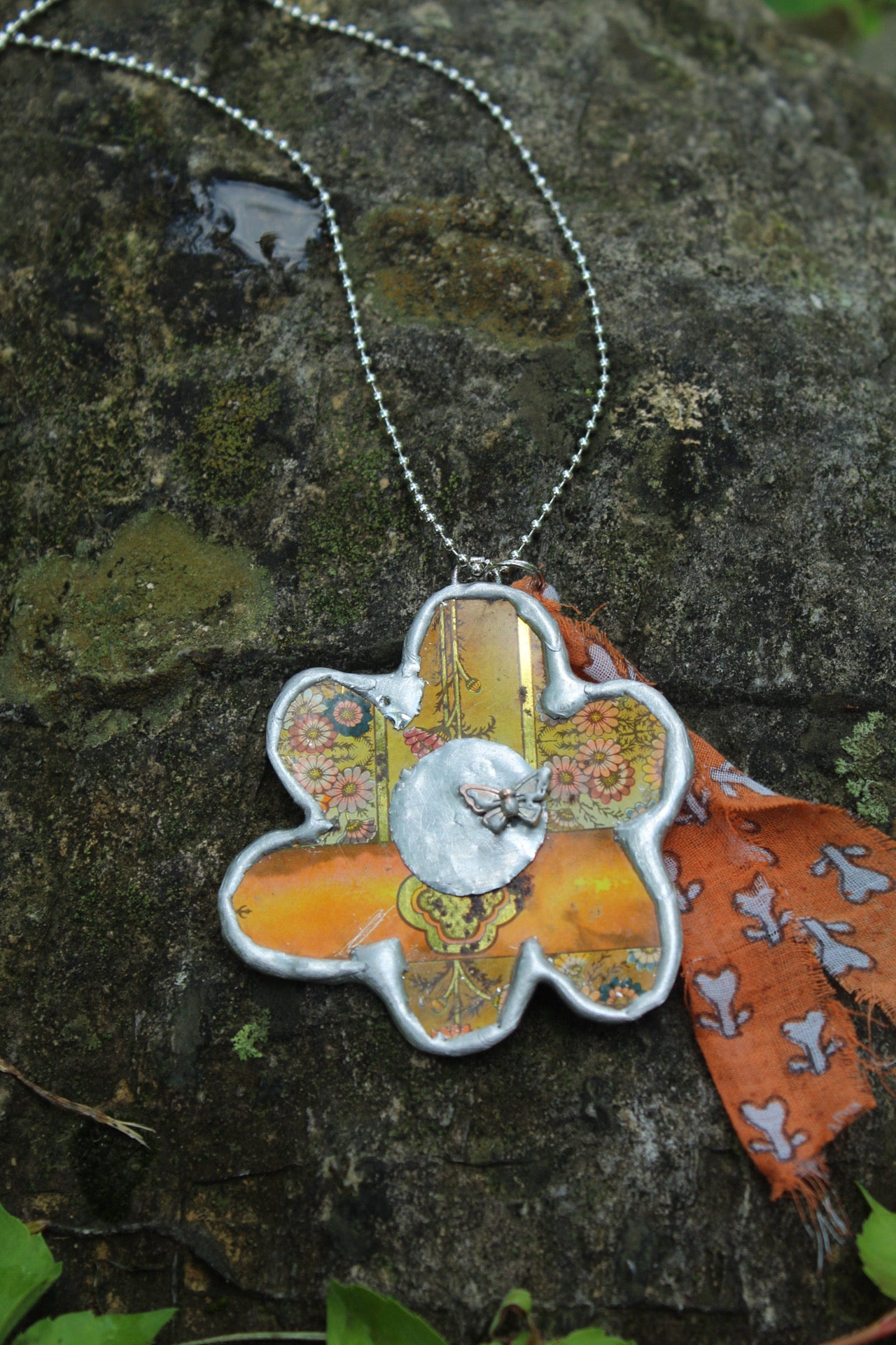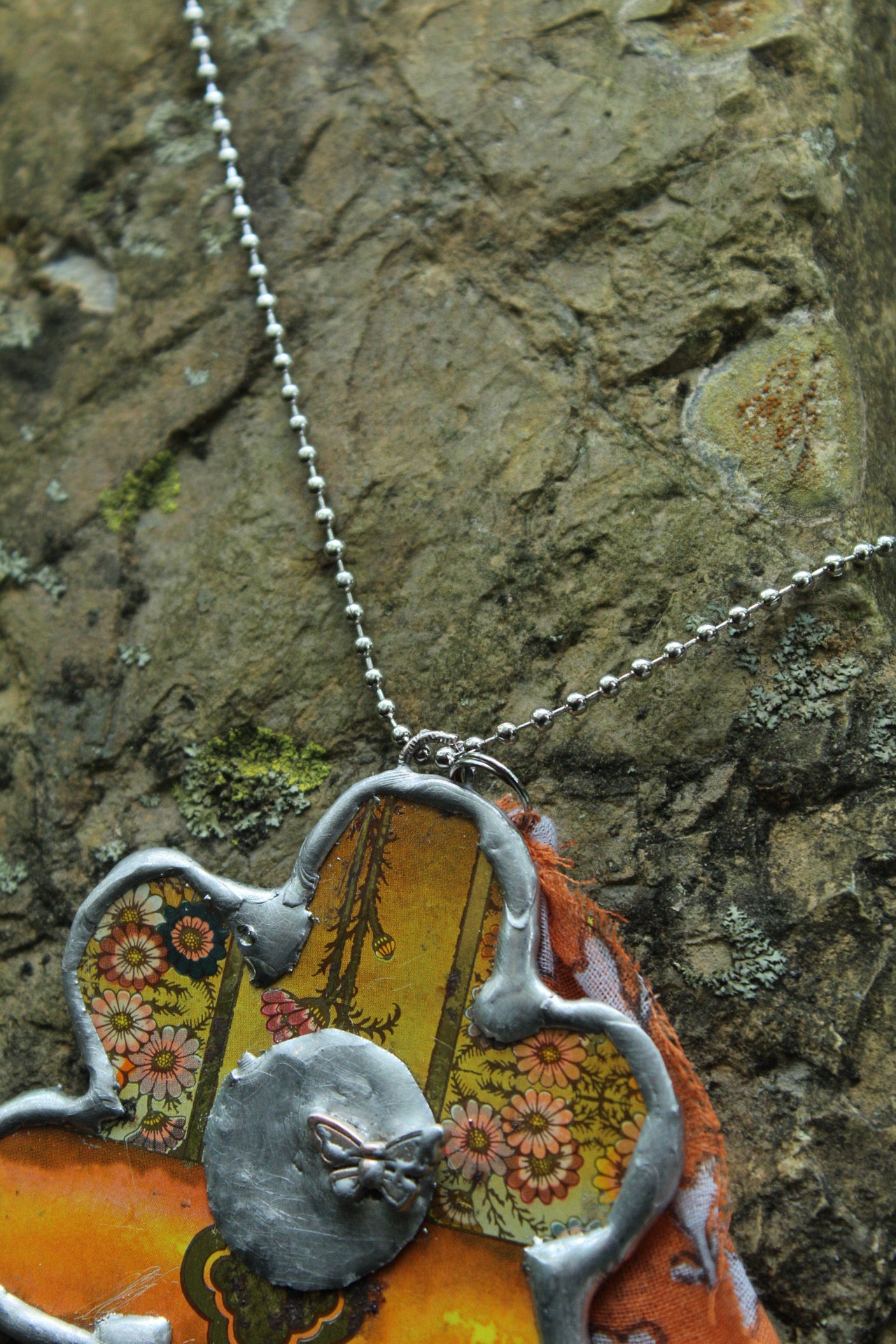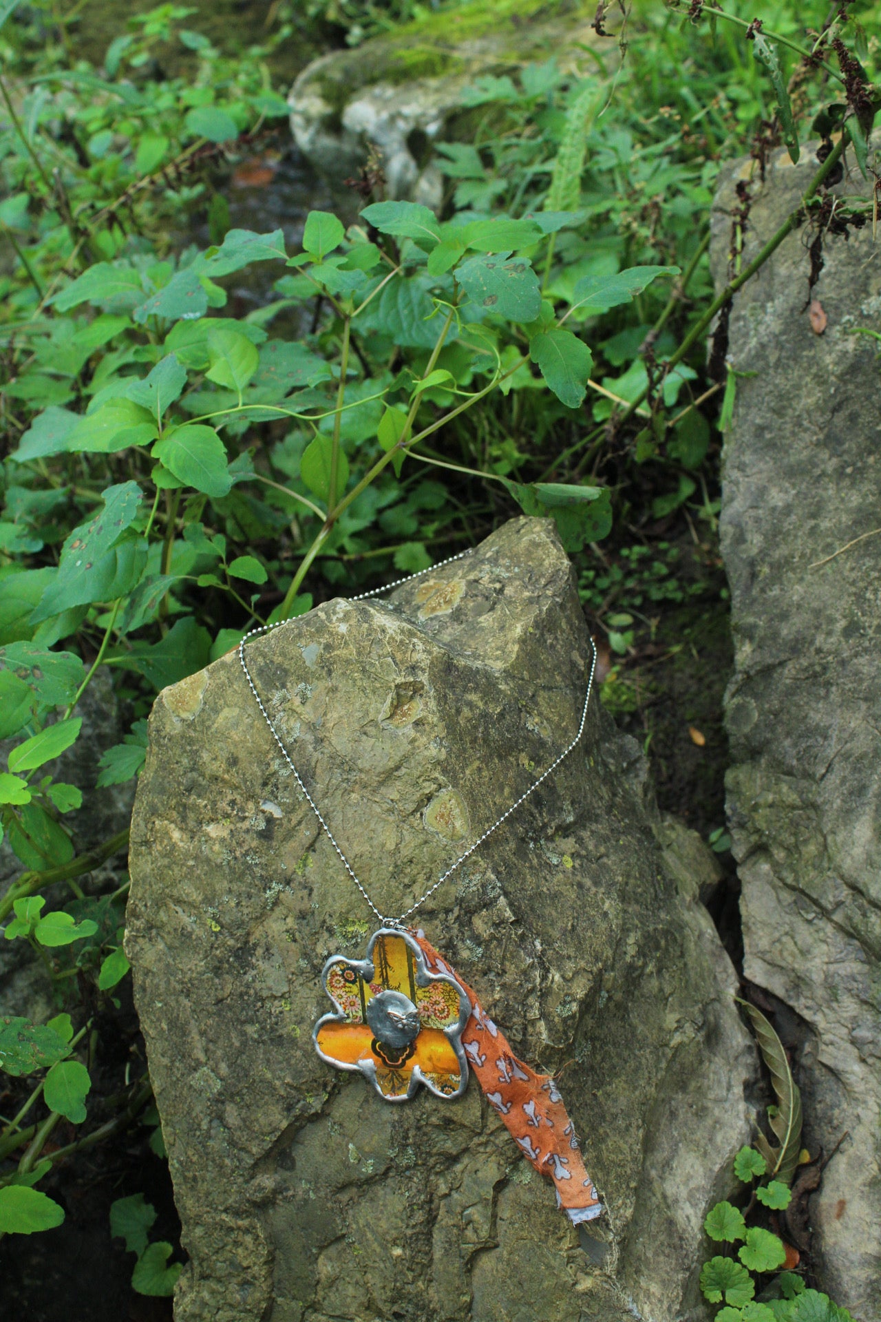 Hand cut and soldered flower from vintage tin, with a fun kantha tassel. On a ball and chain but can change out for another necklace or chain you’ve got at home so cutie and one of a kind