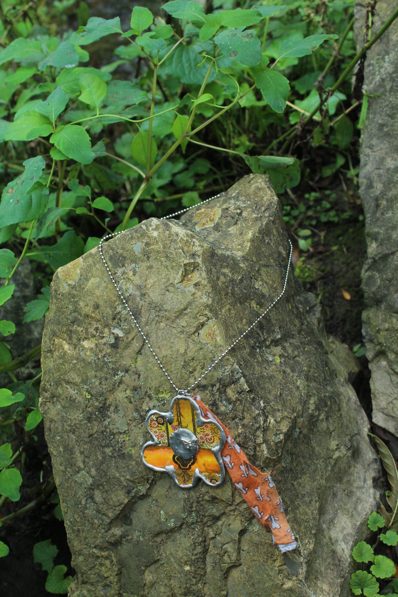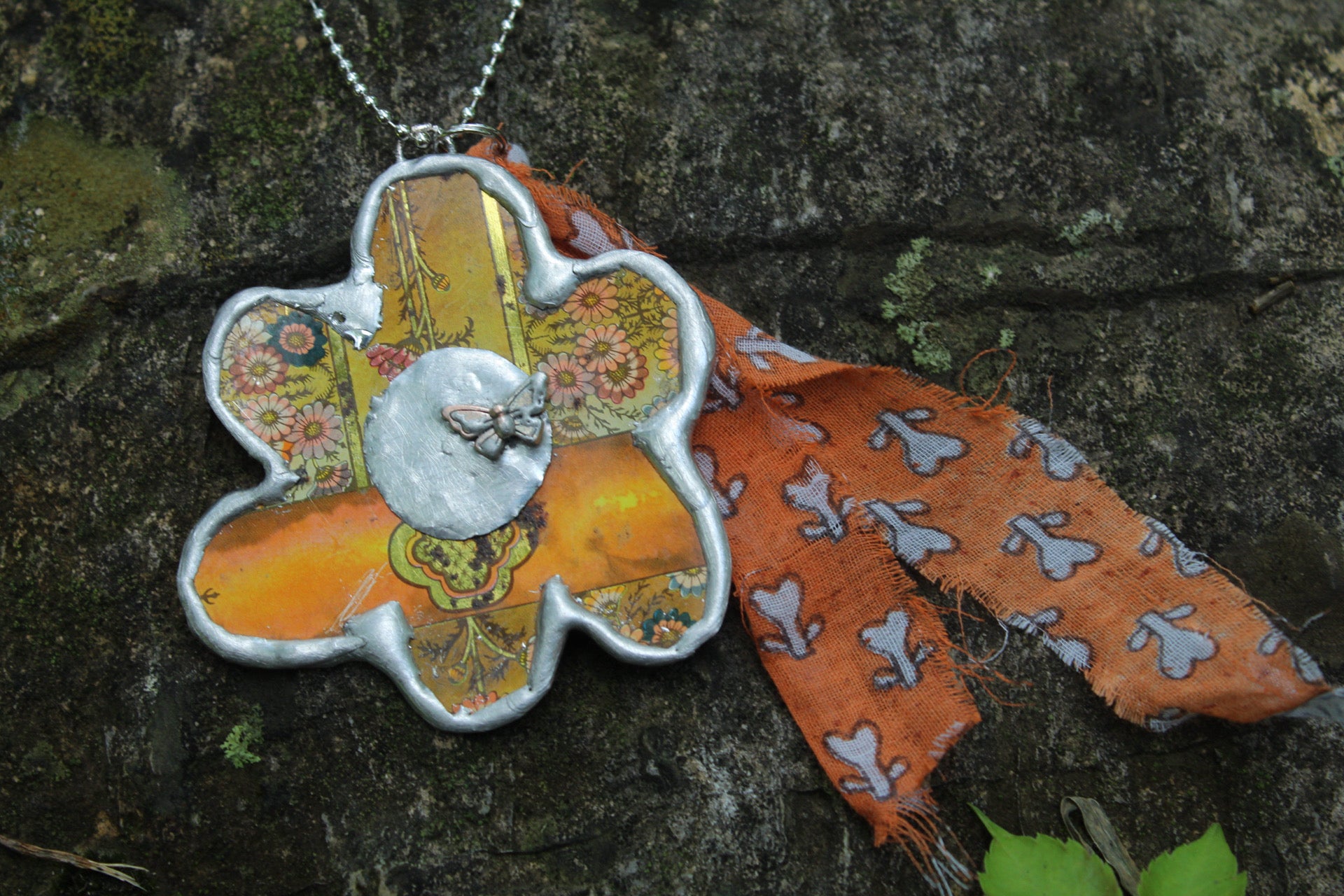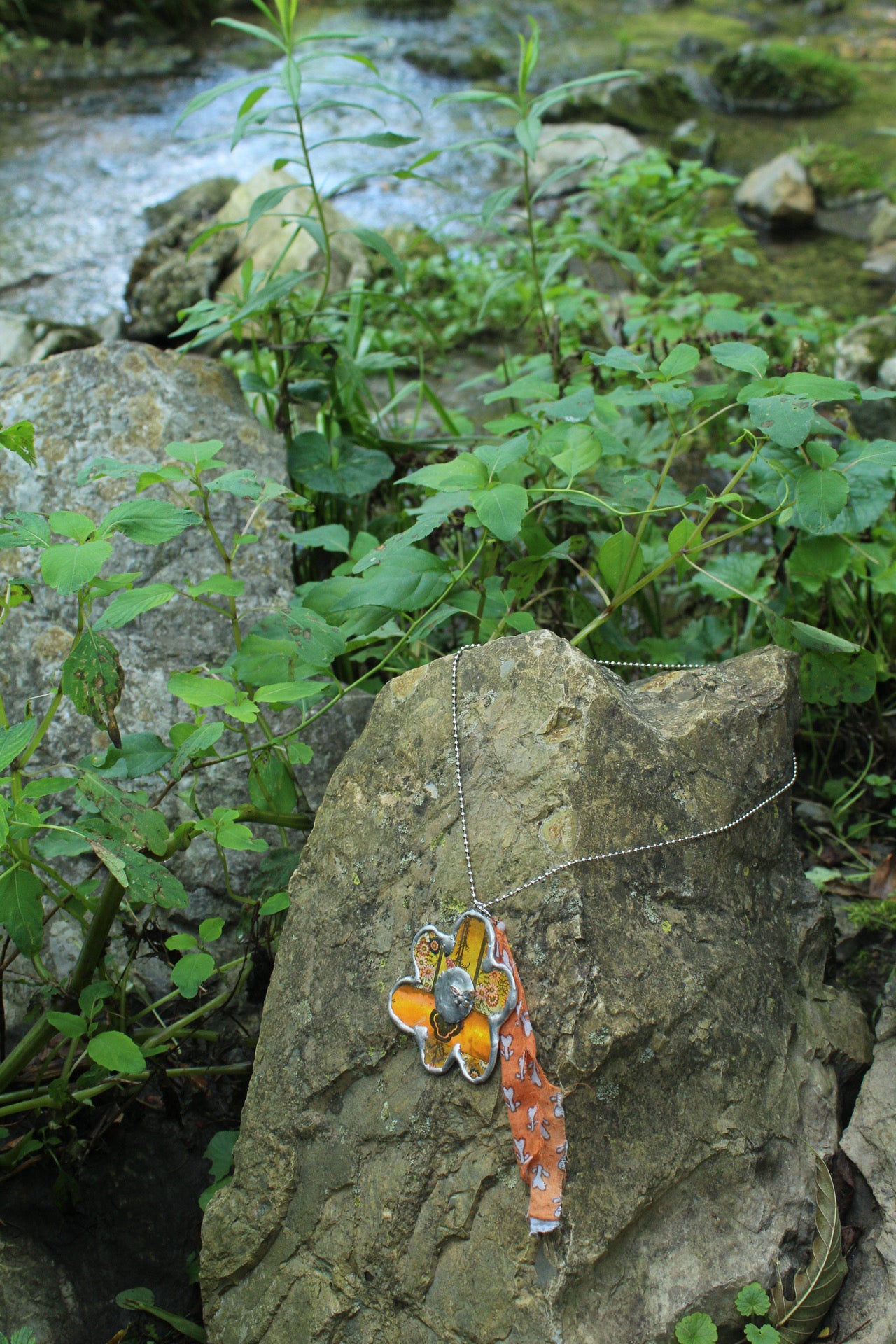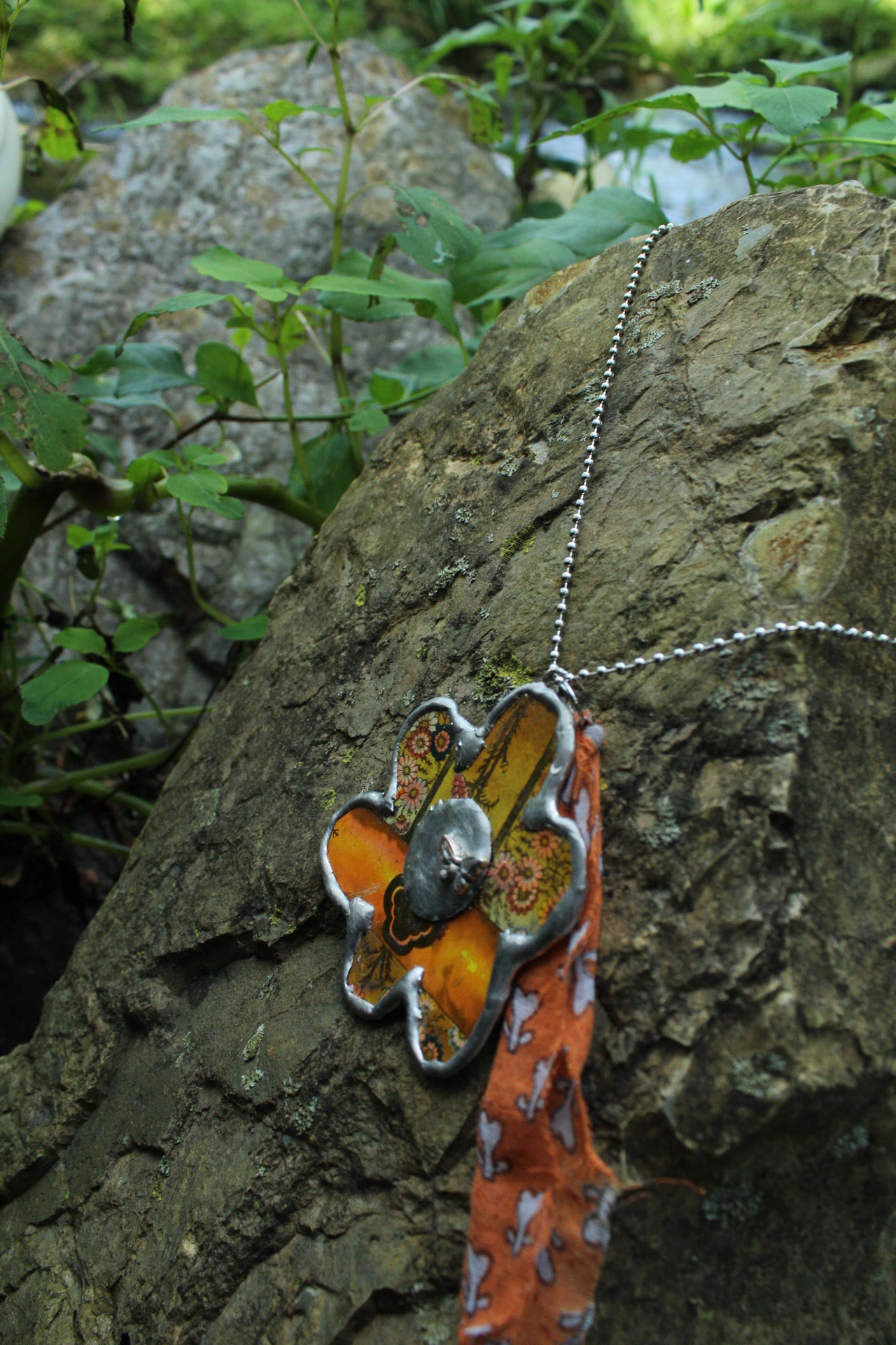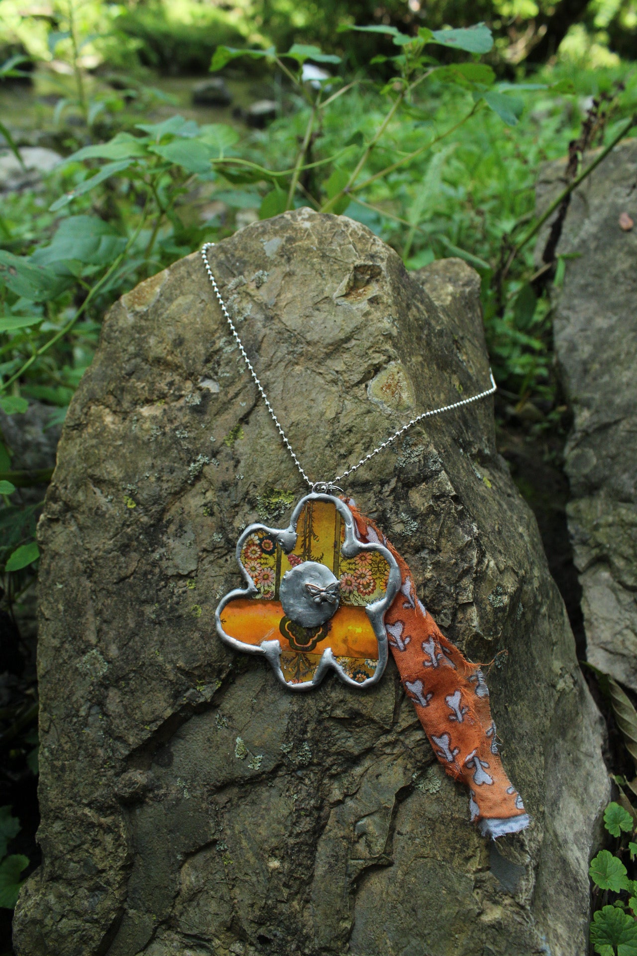 Hand cut and soldered flower from vintage tin, with a fun kantha tassel. On a ball and chain but can change out for another necklace or chain you’ve got at home so cutie and one of a kind