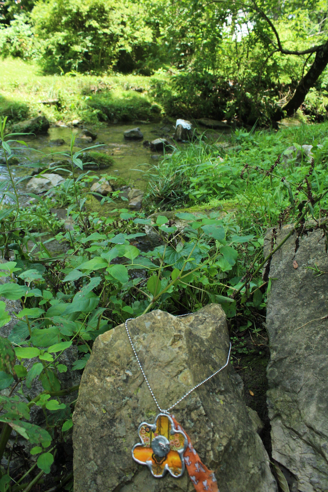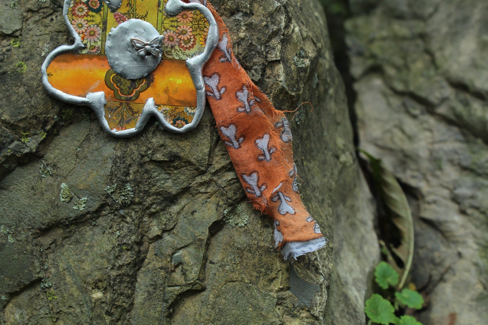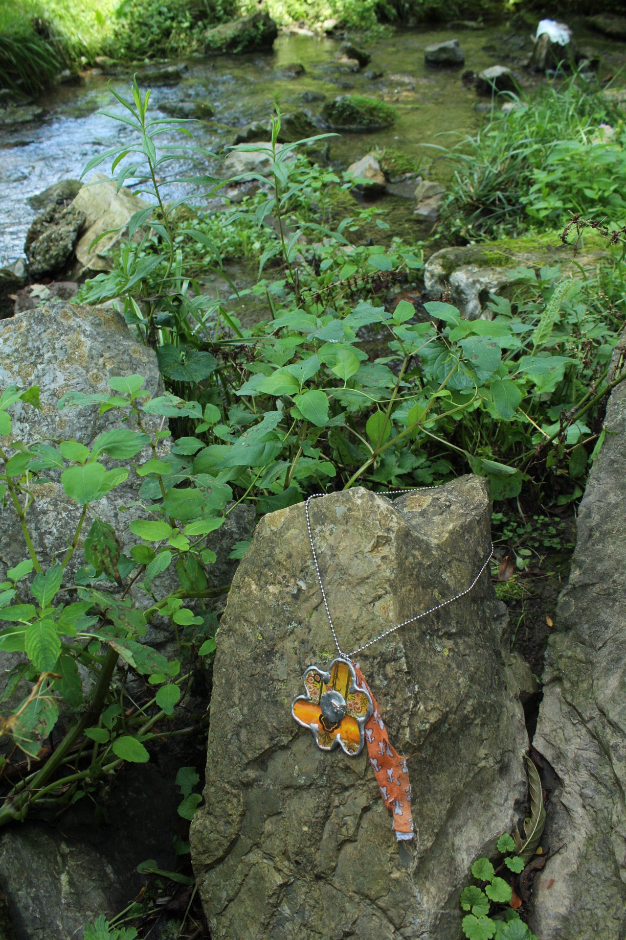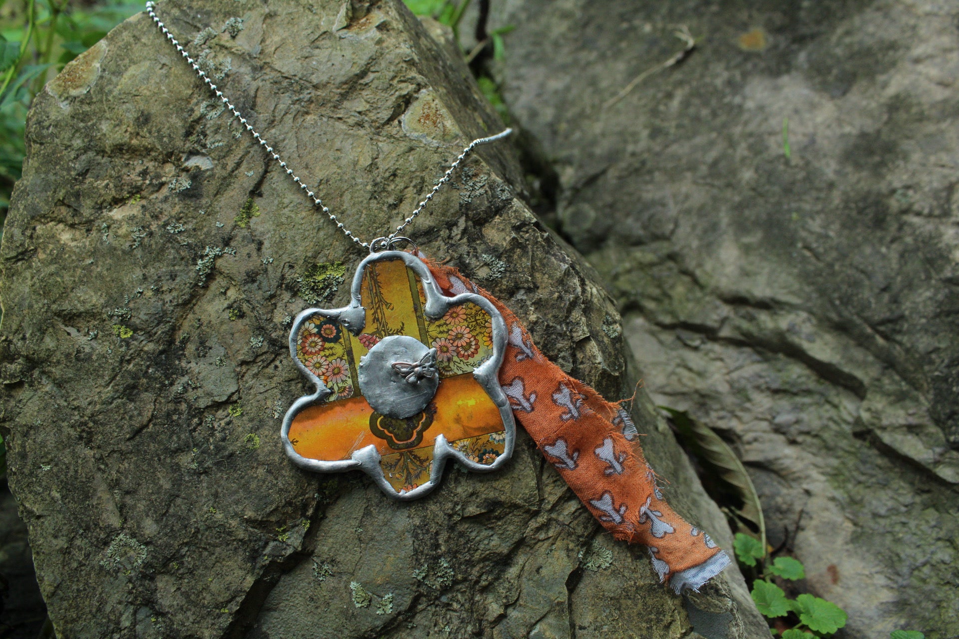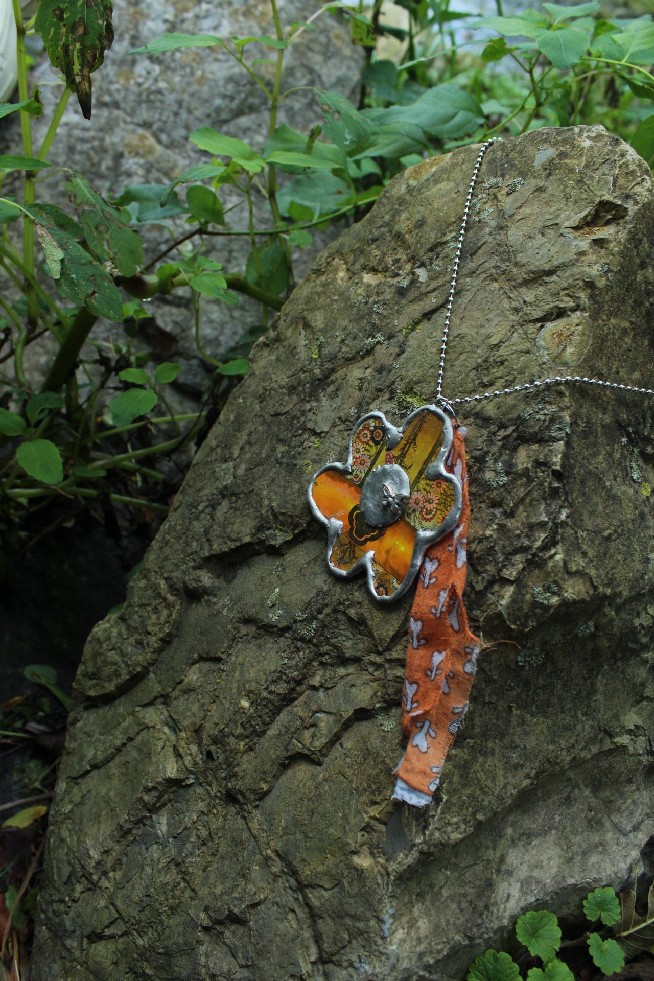Hand cut and soldered flower from vintage tin, with a fun kantha tassel. On a ball and chain but can change out for another necklace or chain you’ve got at home so cutie and one of a kind