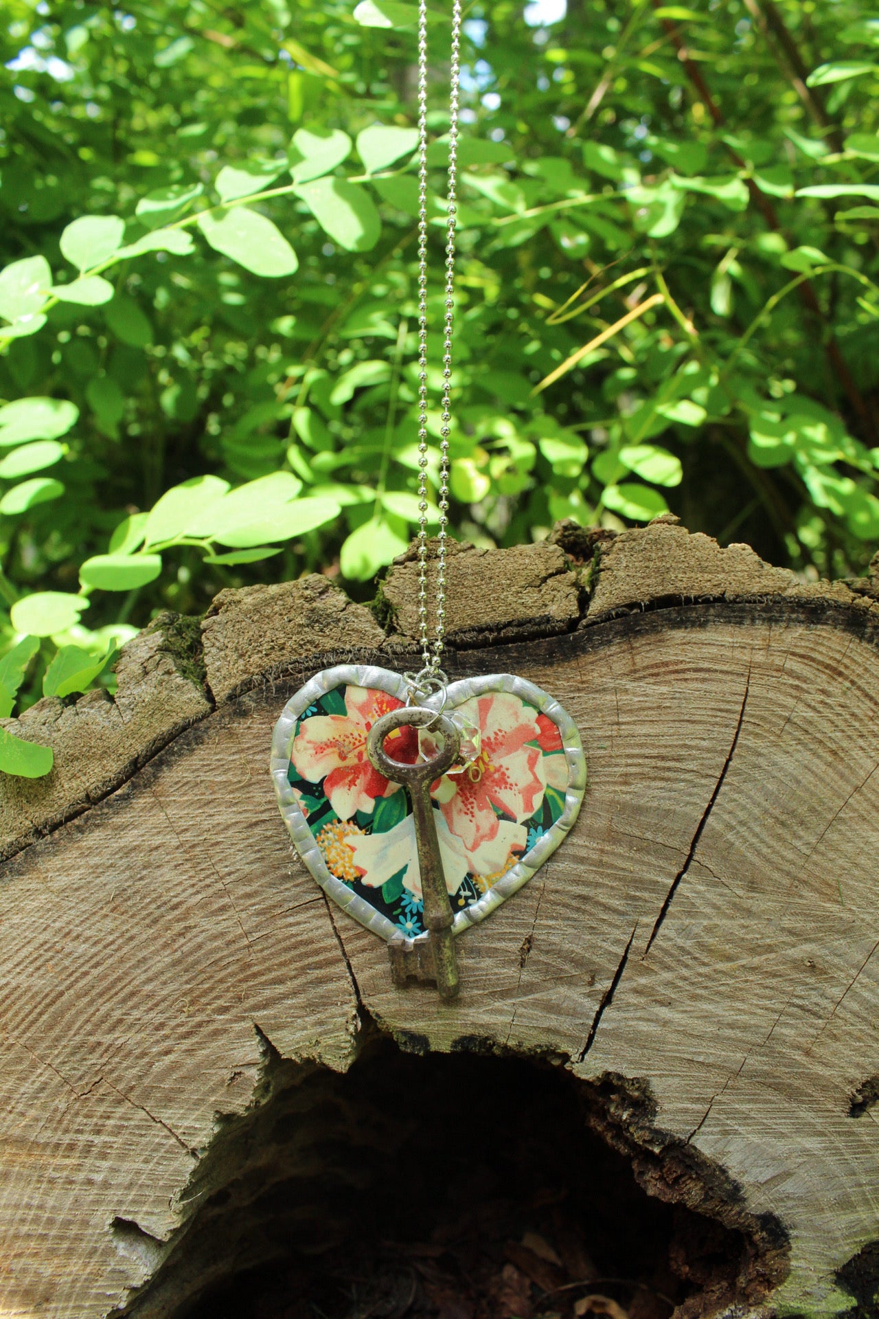 Hand cut and soldered vintage floral tin in shape of heart with an old vintage key and vintage crystal drop. Unique and one of a kind. On ball and chain