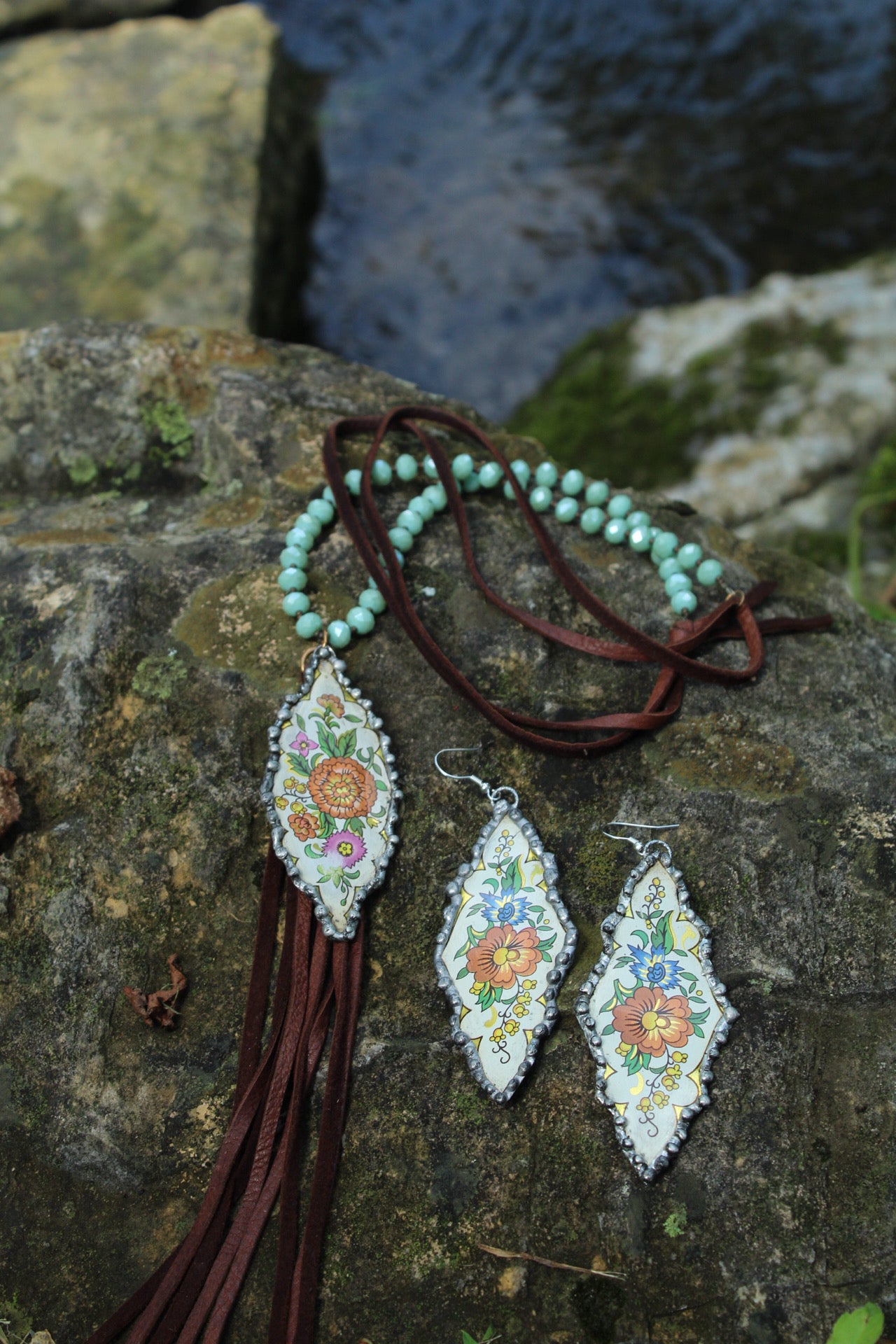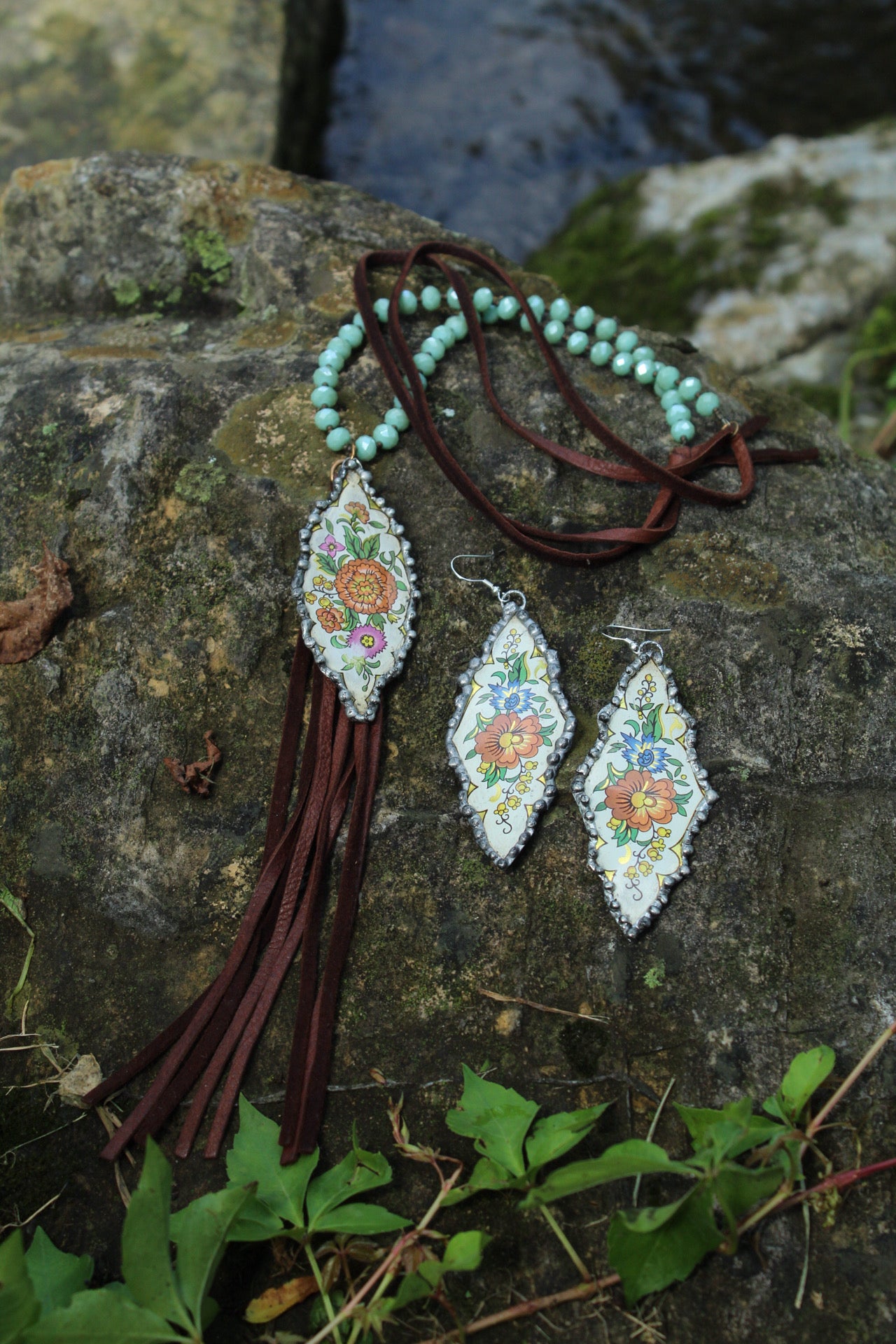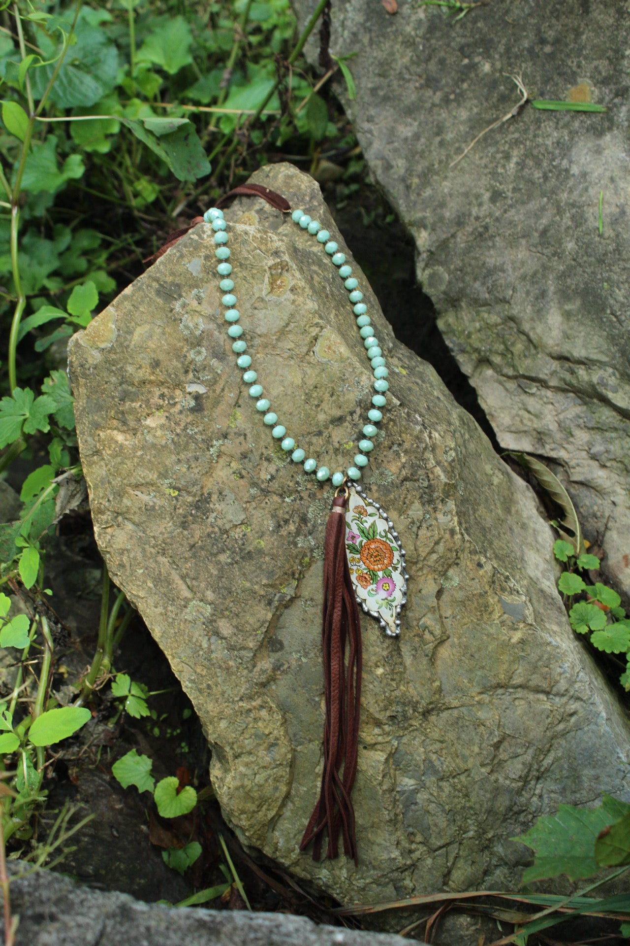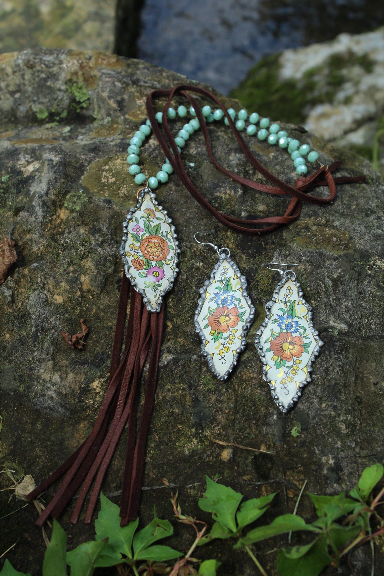 Hand cut and soldered from vintage tin to create pendant. On a genuine leather cord with tassel and beaded necklace. Can purchase earrings separately to match