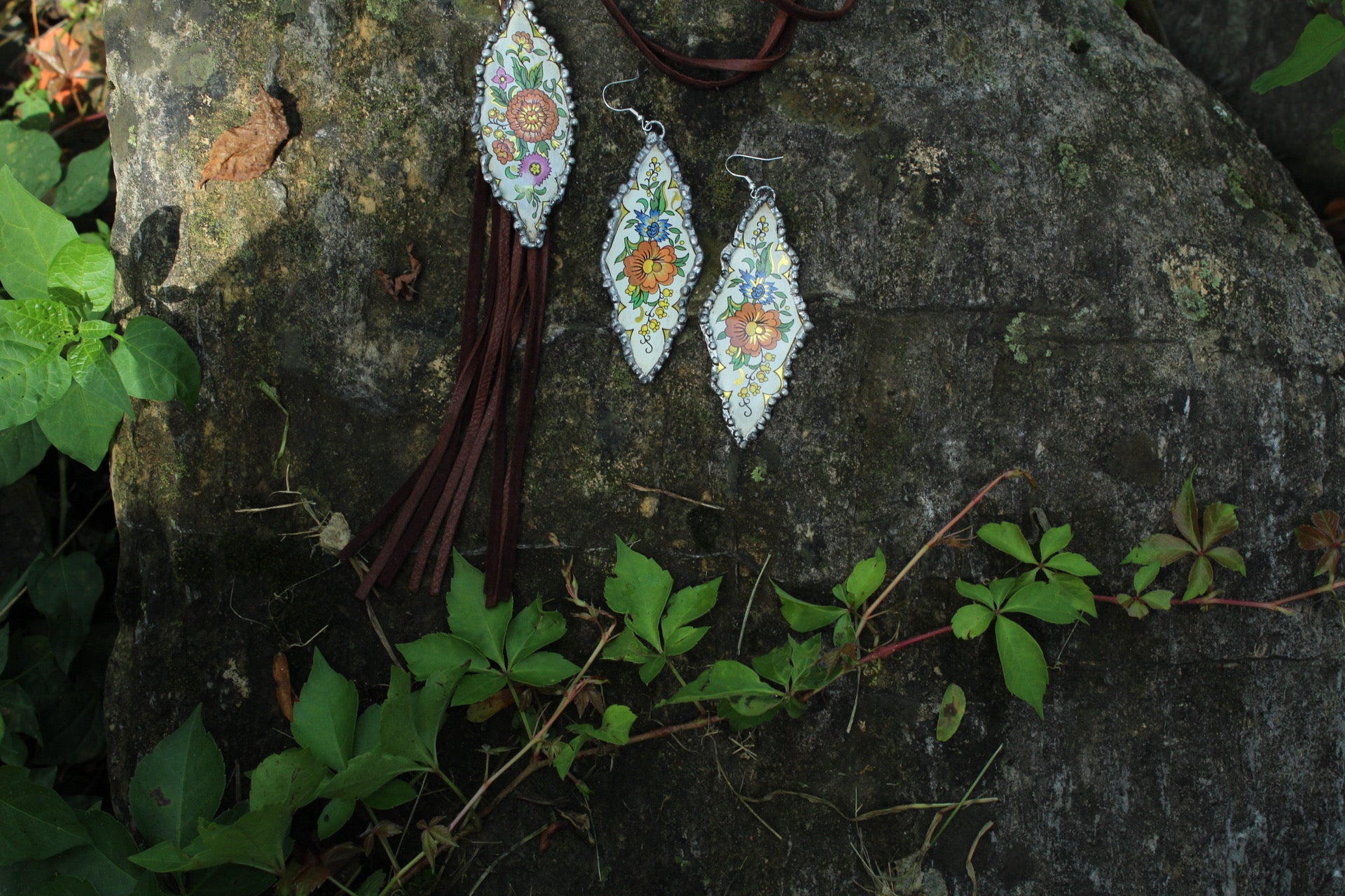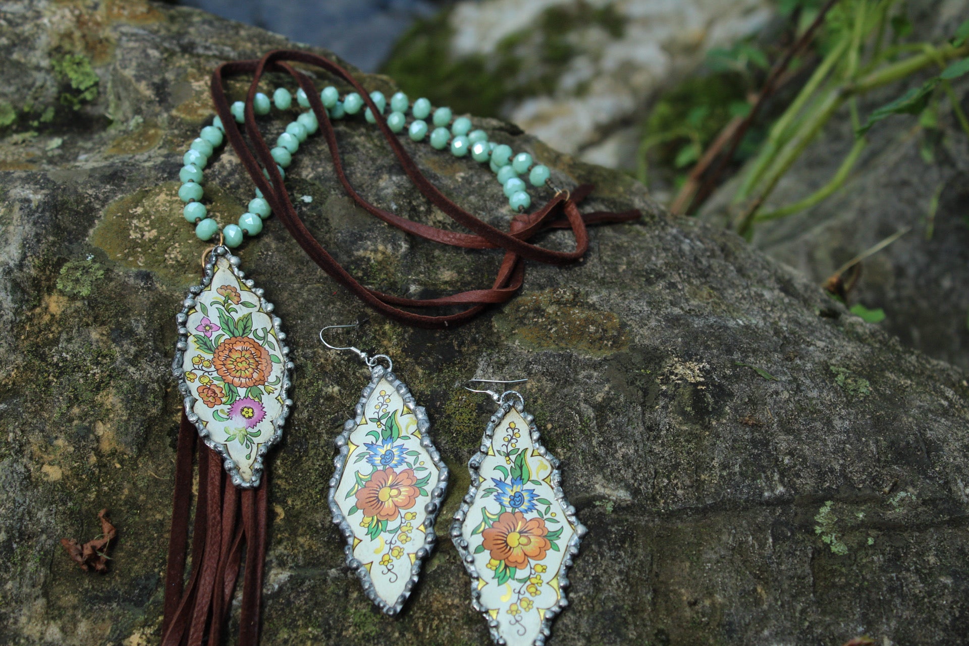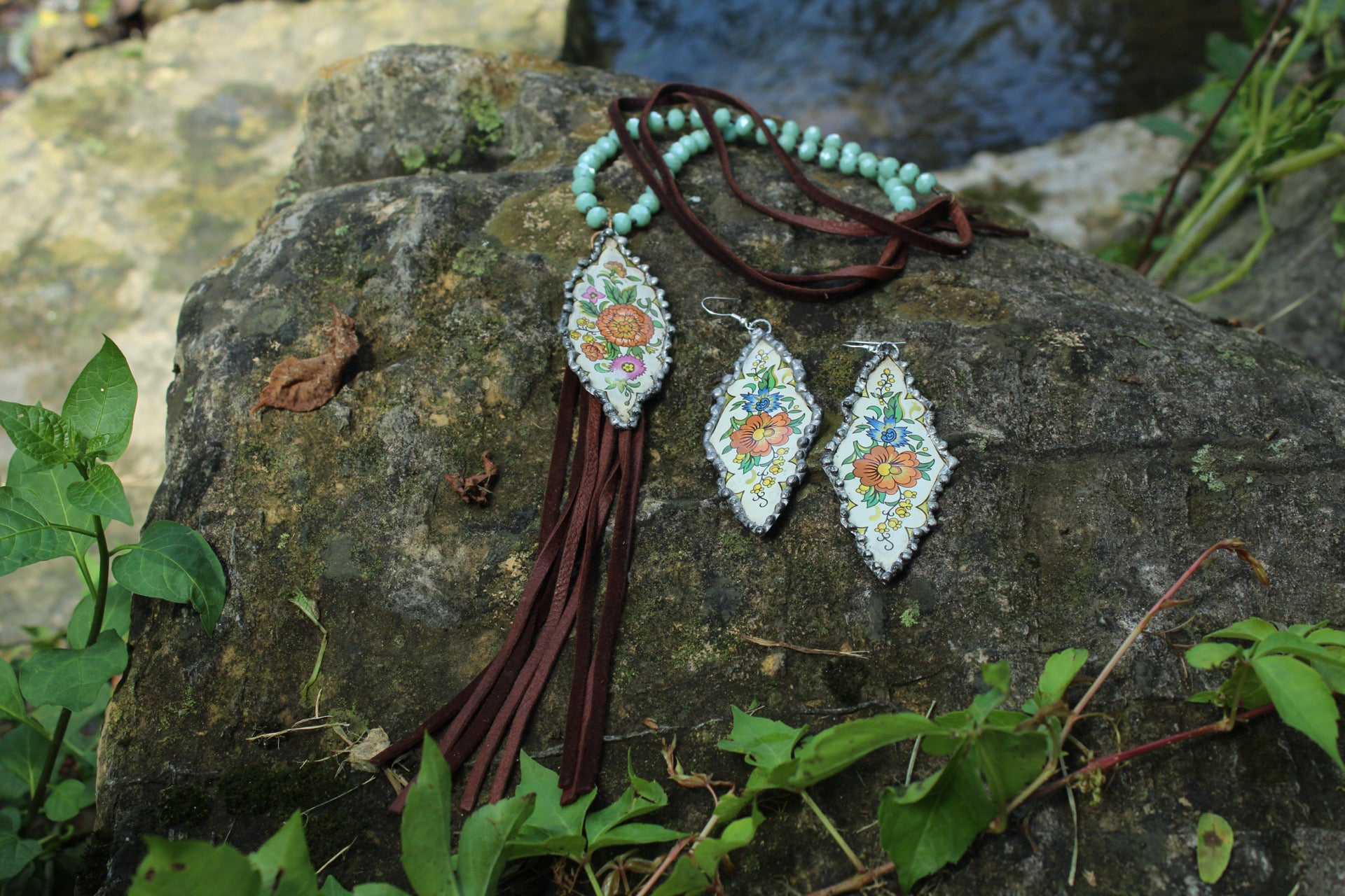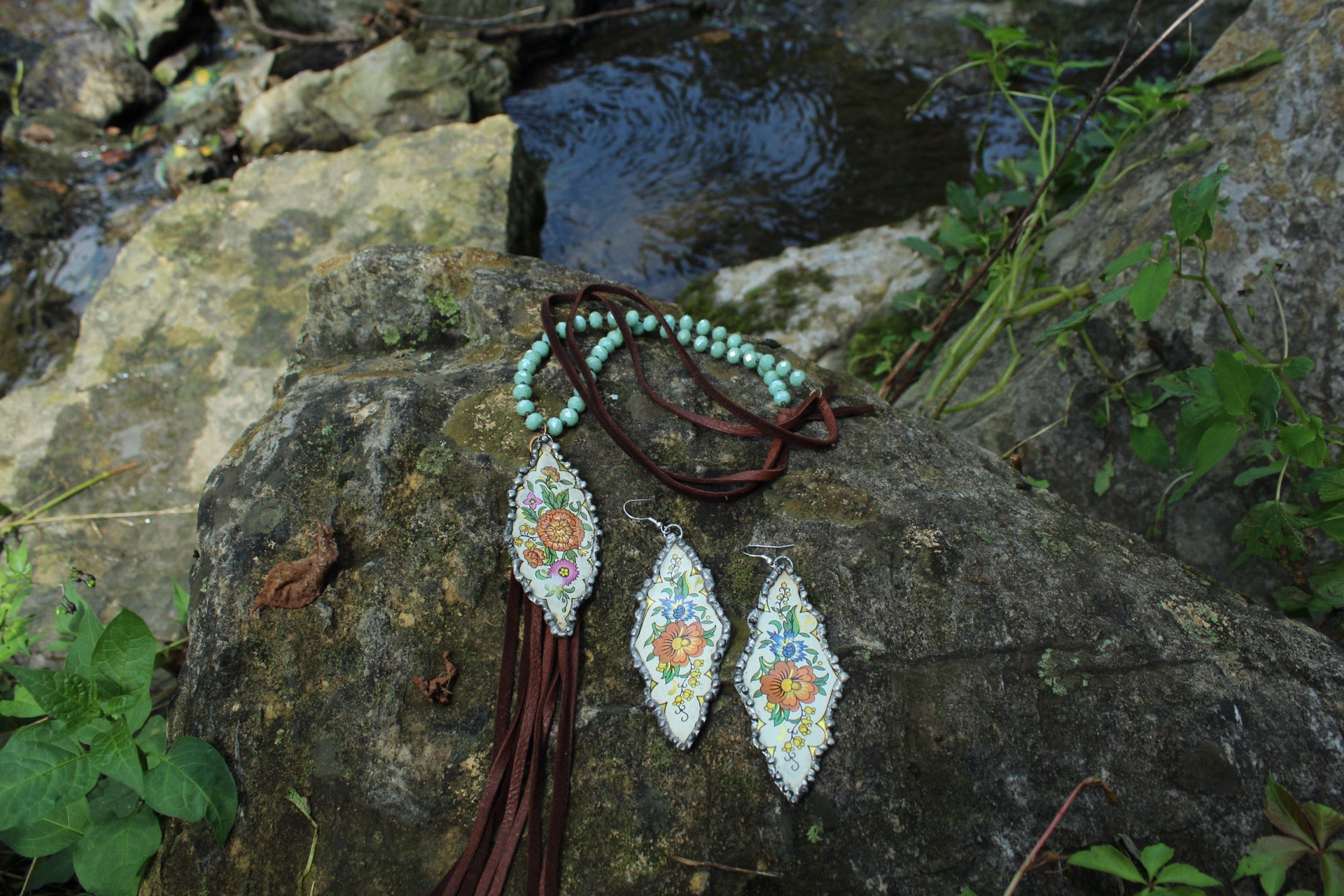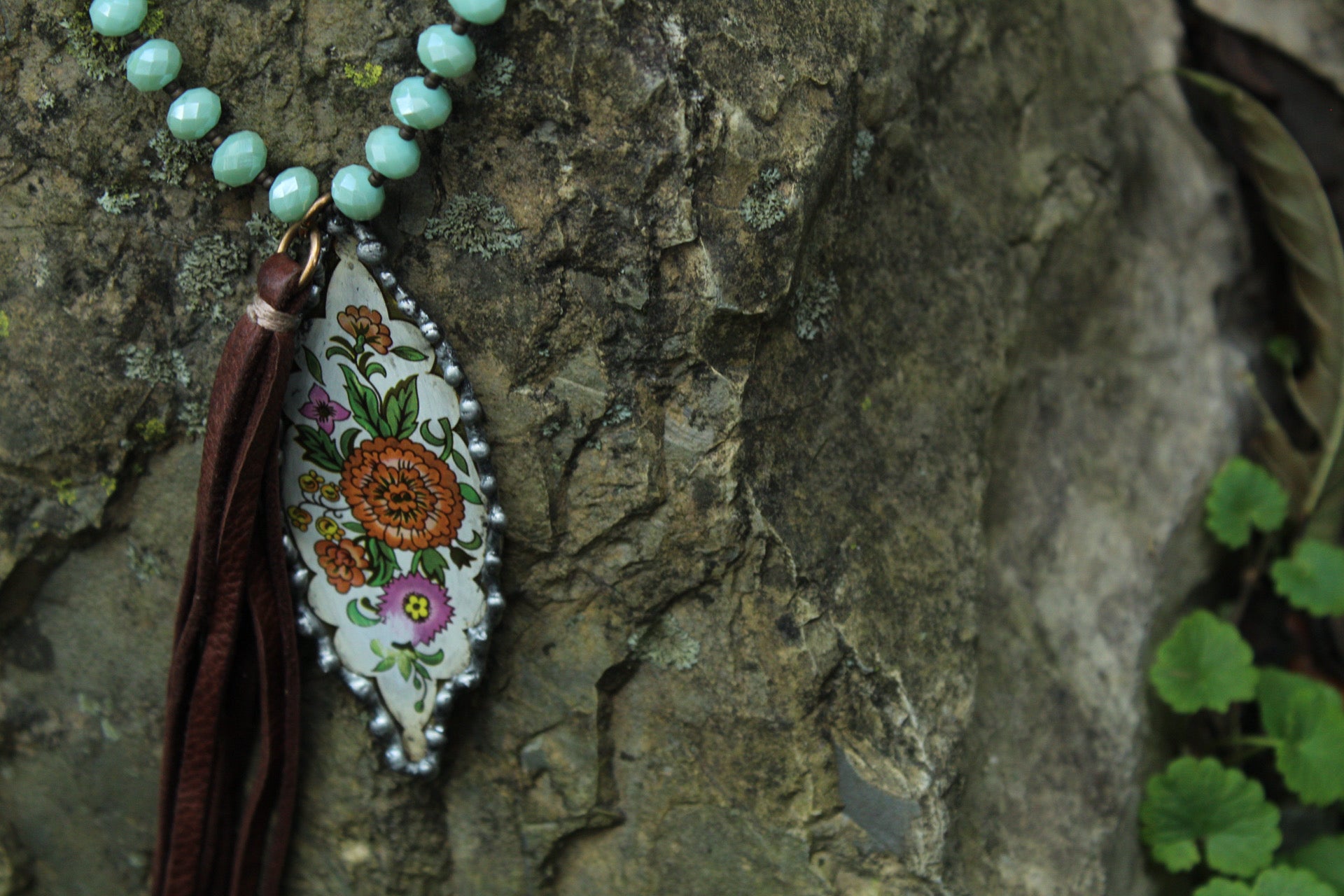 Hand cut and soldered from vintage tin to create pendant. On a genuine leather cord with tassel and beaded necklace. Can purchase earrings separately to match