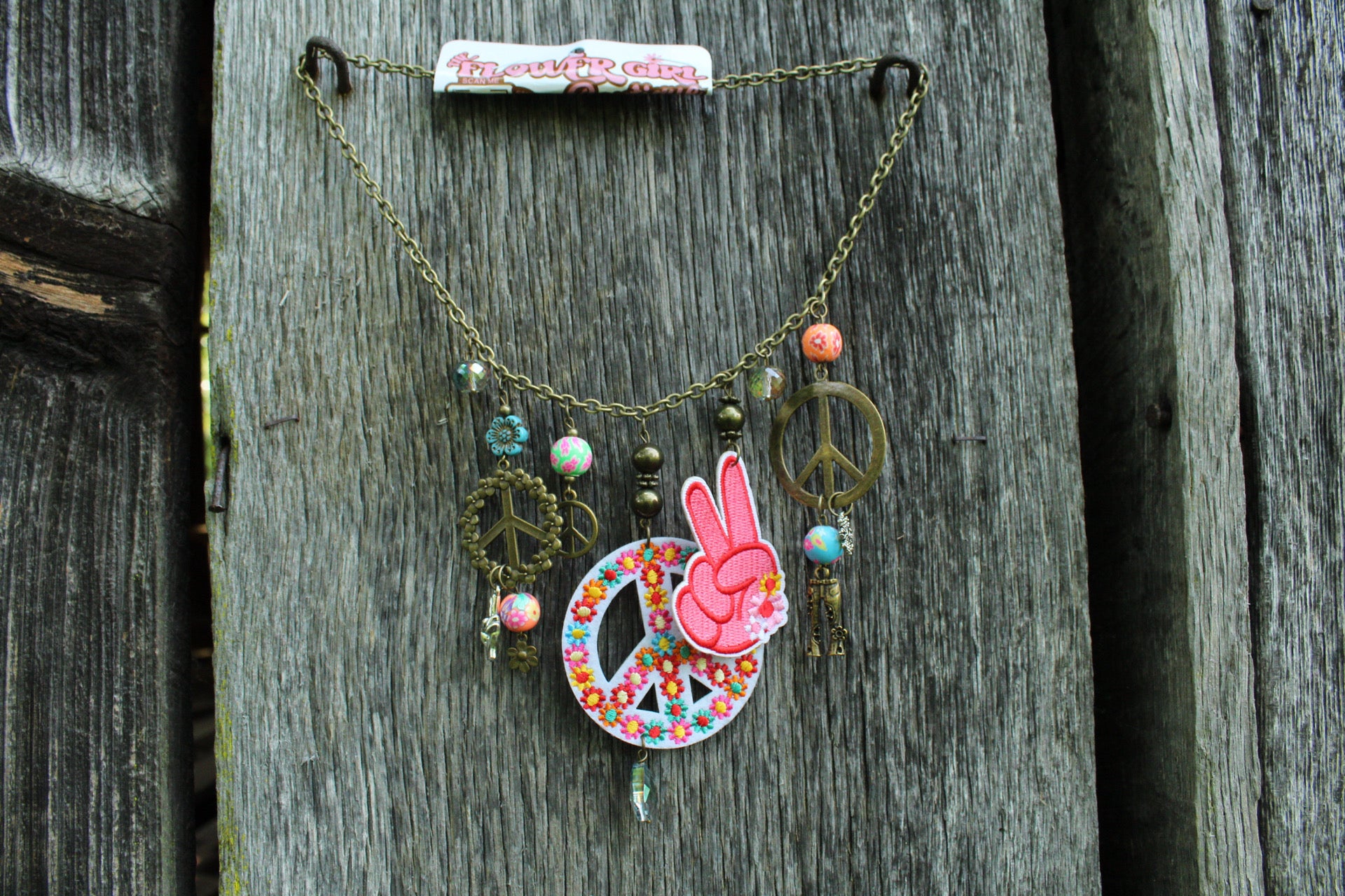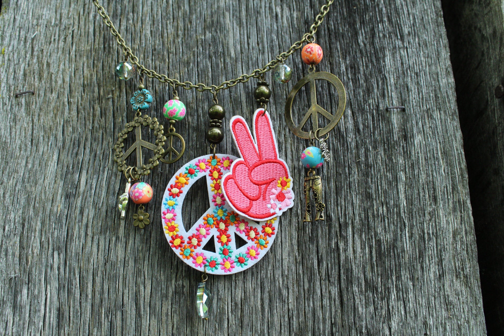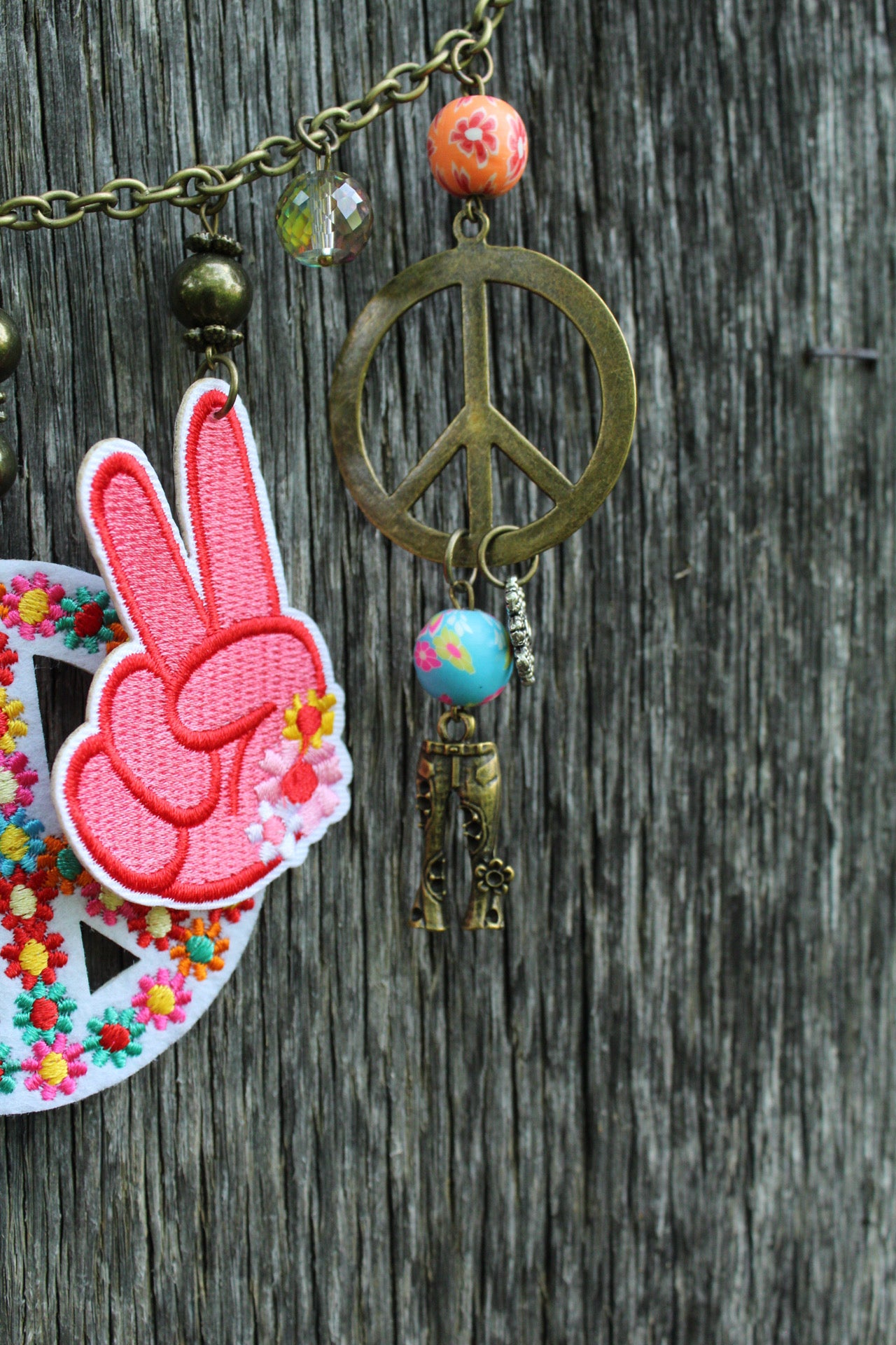 Celebrate the spirit of peace and love with this handcrafted statement necklace by The Primitive Peddler. This vibrant piece features a large embroidered peace symbol charm adorned with colorful flowers and a bold pink embroidered peace sign hand. The playful, bohemian aesthetic is complemented by an array of floral beads, faceted crystals, and antique bronze-tone accents, including peace symbols and tiny charms.