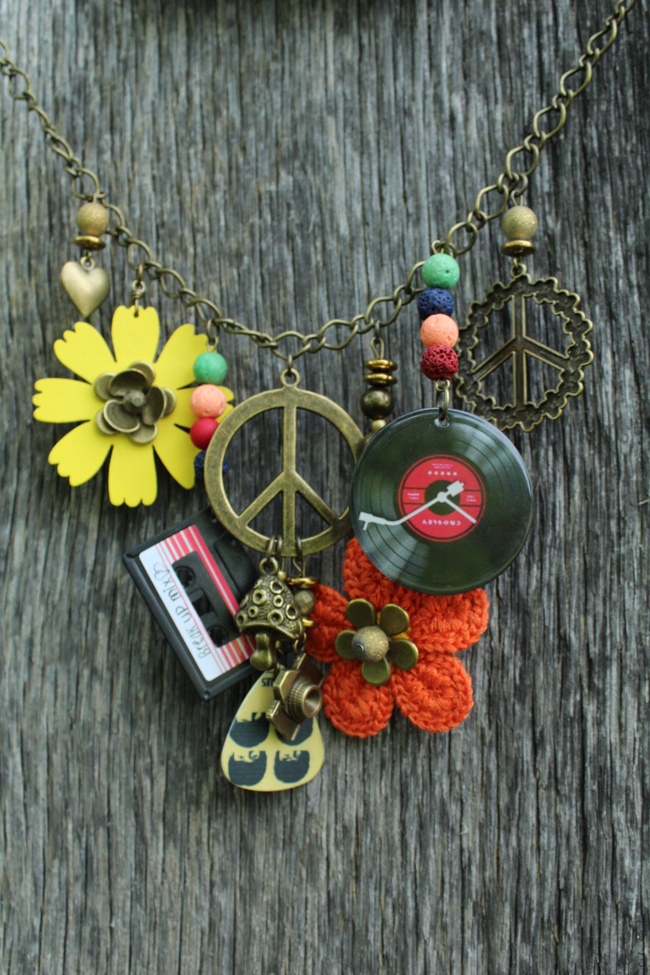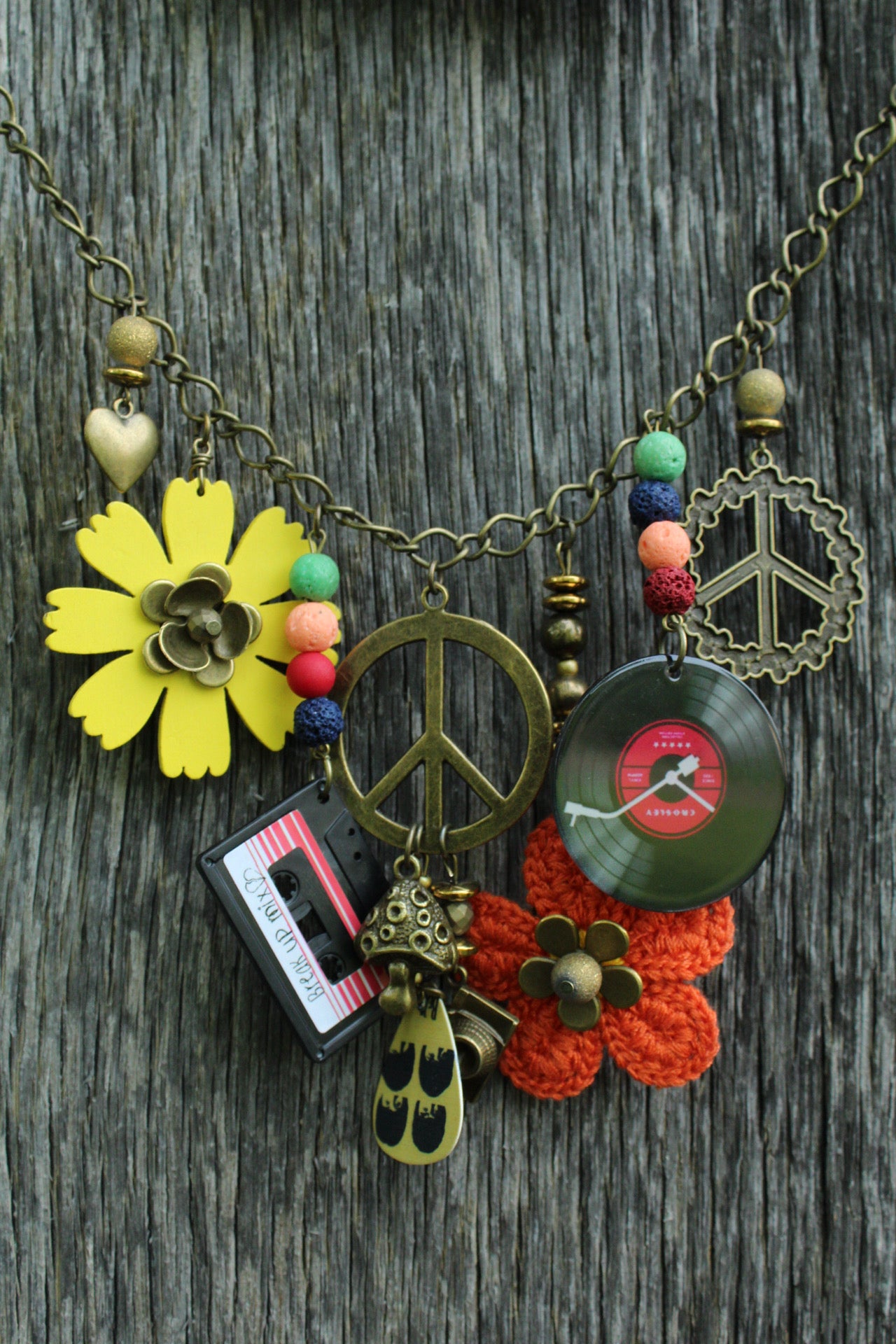 Channel vintage vibes and playful creativity with this handmade statement necklace by The Primitive Peddler. This vibrant piece features an eclectic mix of charms, including a bright yellow metal flower, crochet orange flower, vintage peace symbols, a fun miniature vinyl record, and a tiny cassette tape with a “Back Up Mix” label. Completing the look are colorful beads, antique bronze-tone findings, and quirky details like a guitar pick charm with an elephant graphic, metallic heart charm, and textured mushroom bead.