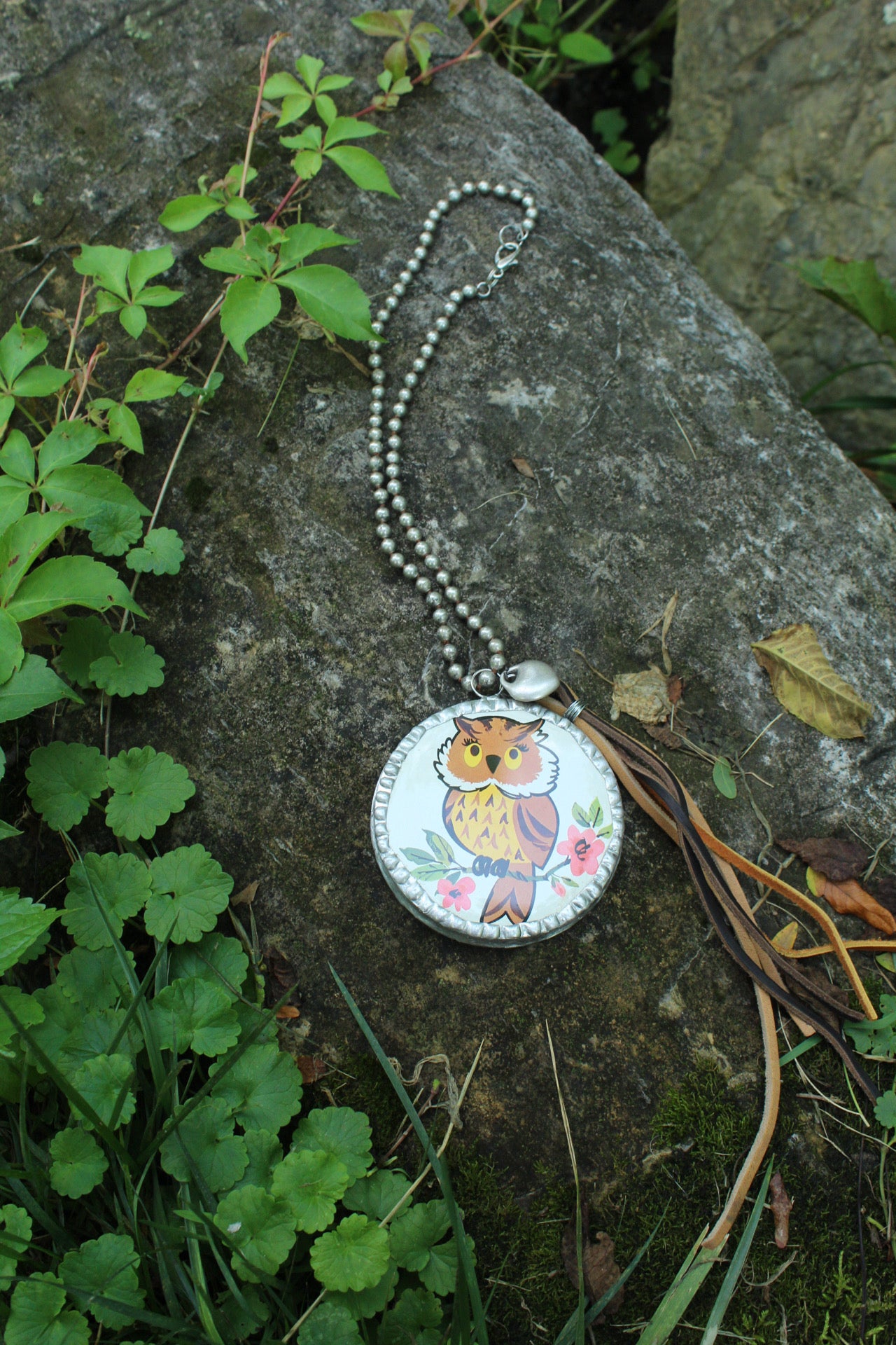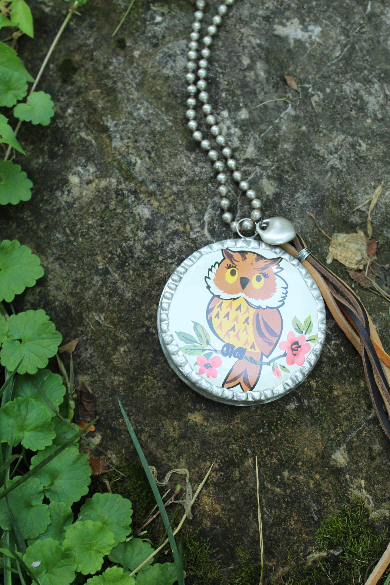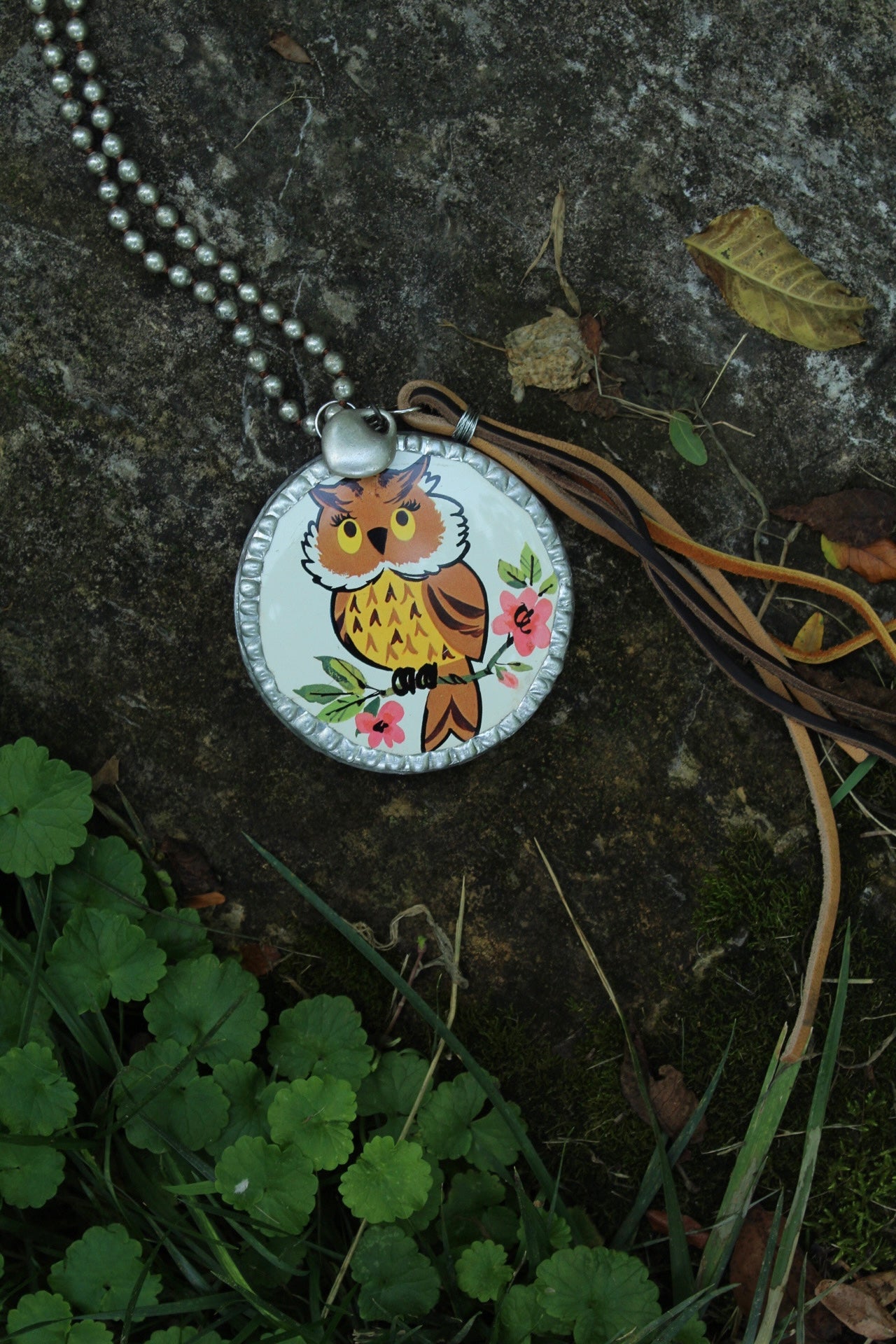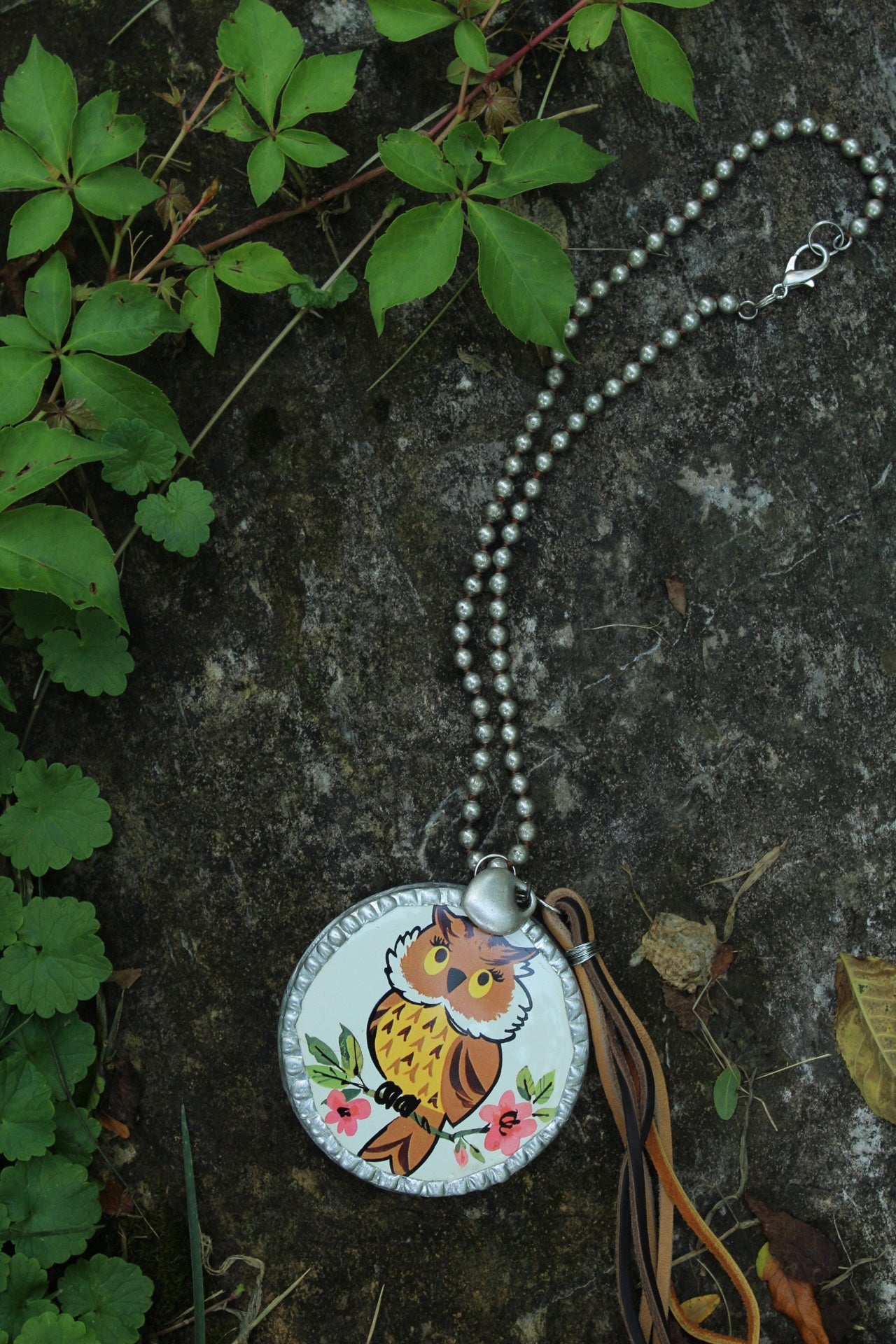 60-70s vintage owl tin transformed and soldered into a beautiful pendant with a silver heart and genuine leather tassel. Handmade unique and so special one of a kind. On a faux navajo pearl strand. Huge pendant about the size of my hand :)