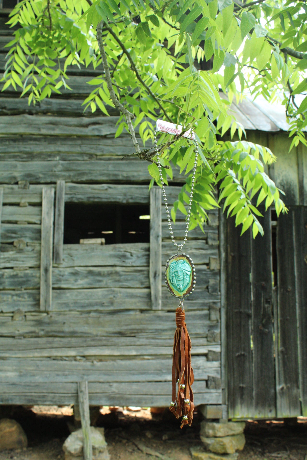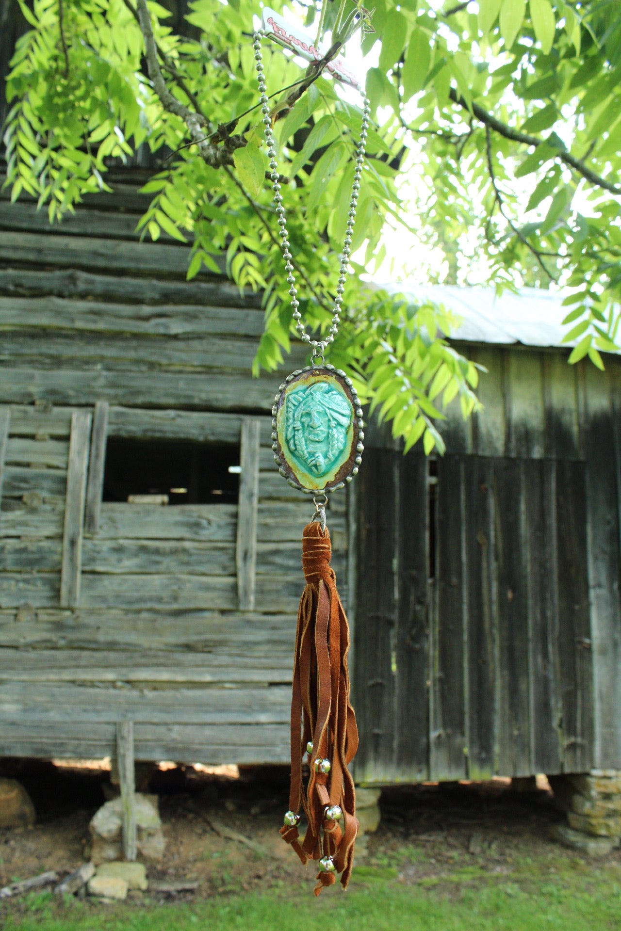 This one-of-a-kind statement necklace is an original creation by Art by Amy, blending artisan craftsmanship with rustic elegance. The focal point is a meticulously hand-sculpted pottery medallion featuring an Indian head design, rich in detail and culture. Encased in a textured silver-toned bezel, the medallion is complemented by a luxurious brown leather tassel with delicate silver-tone bells, adding movement and charm to the piece.