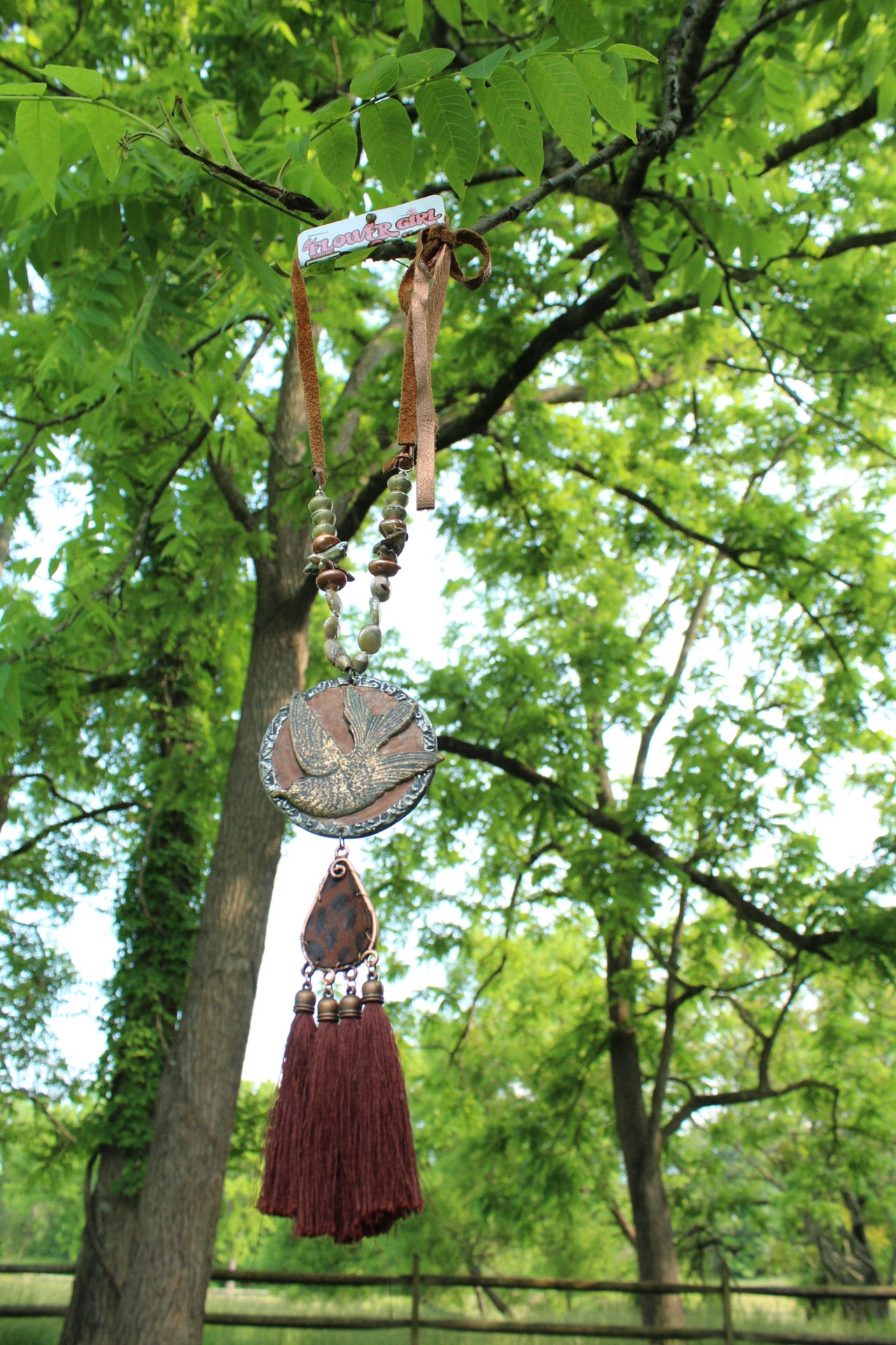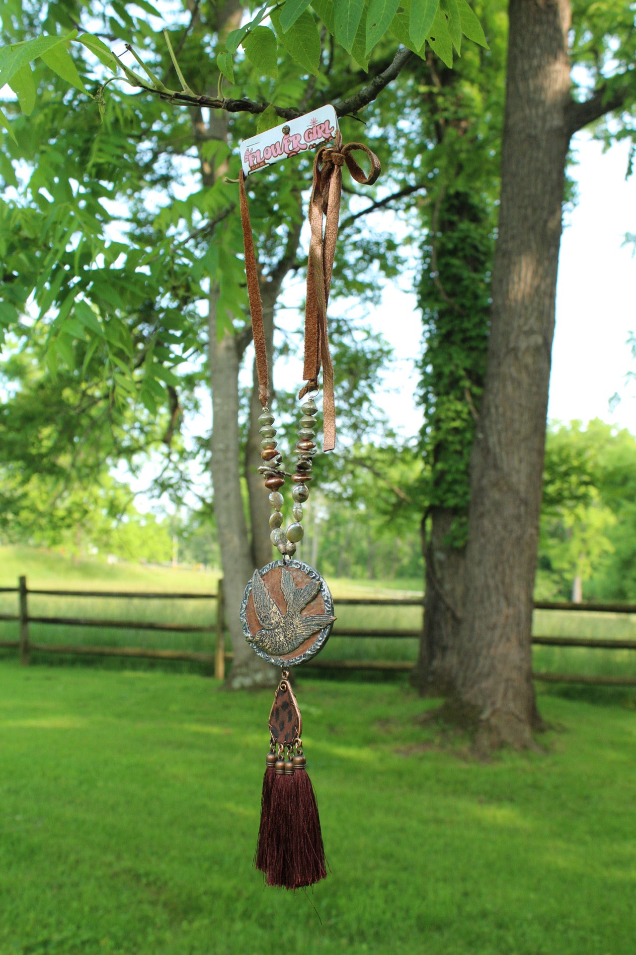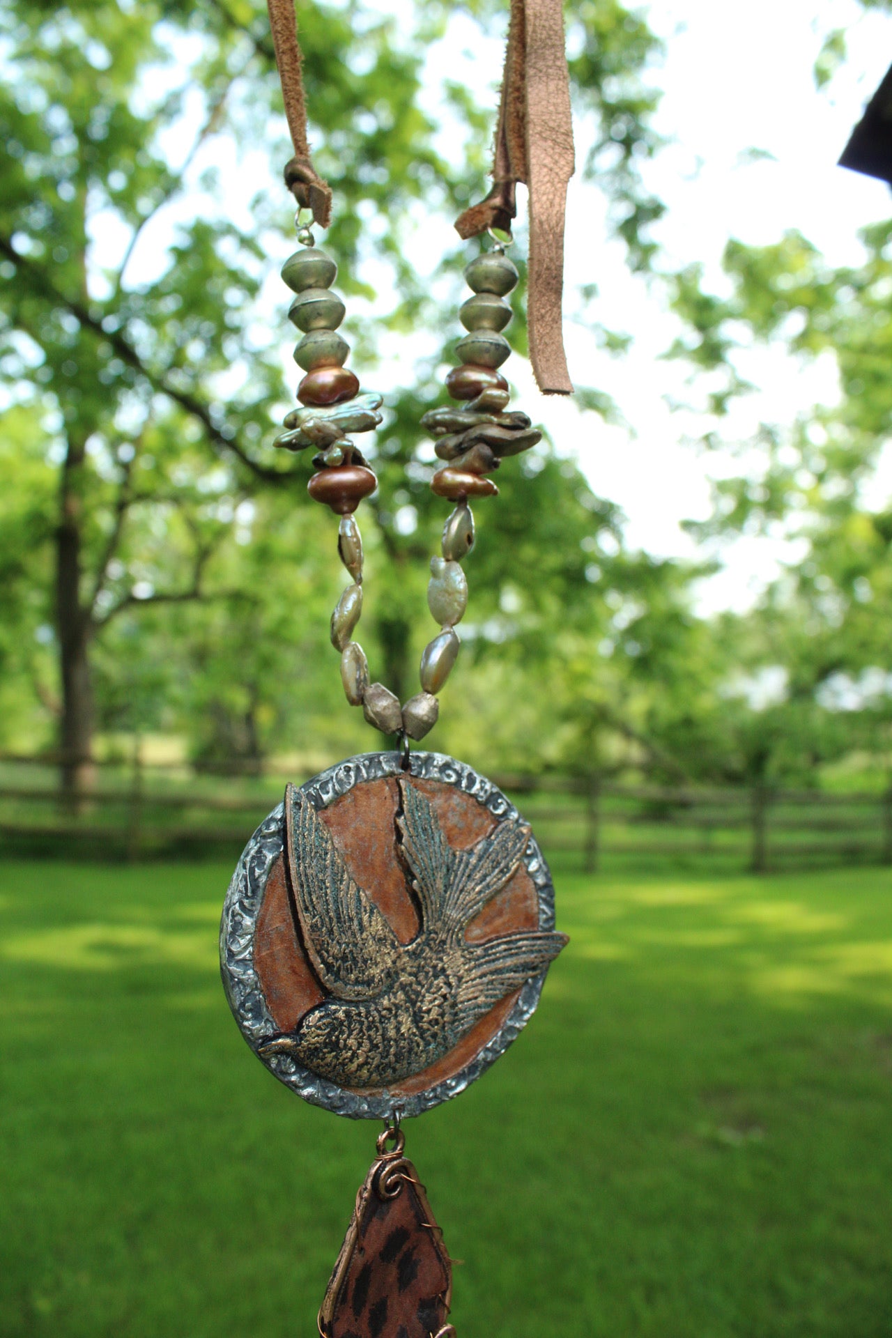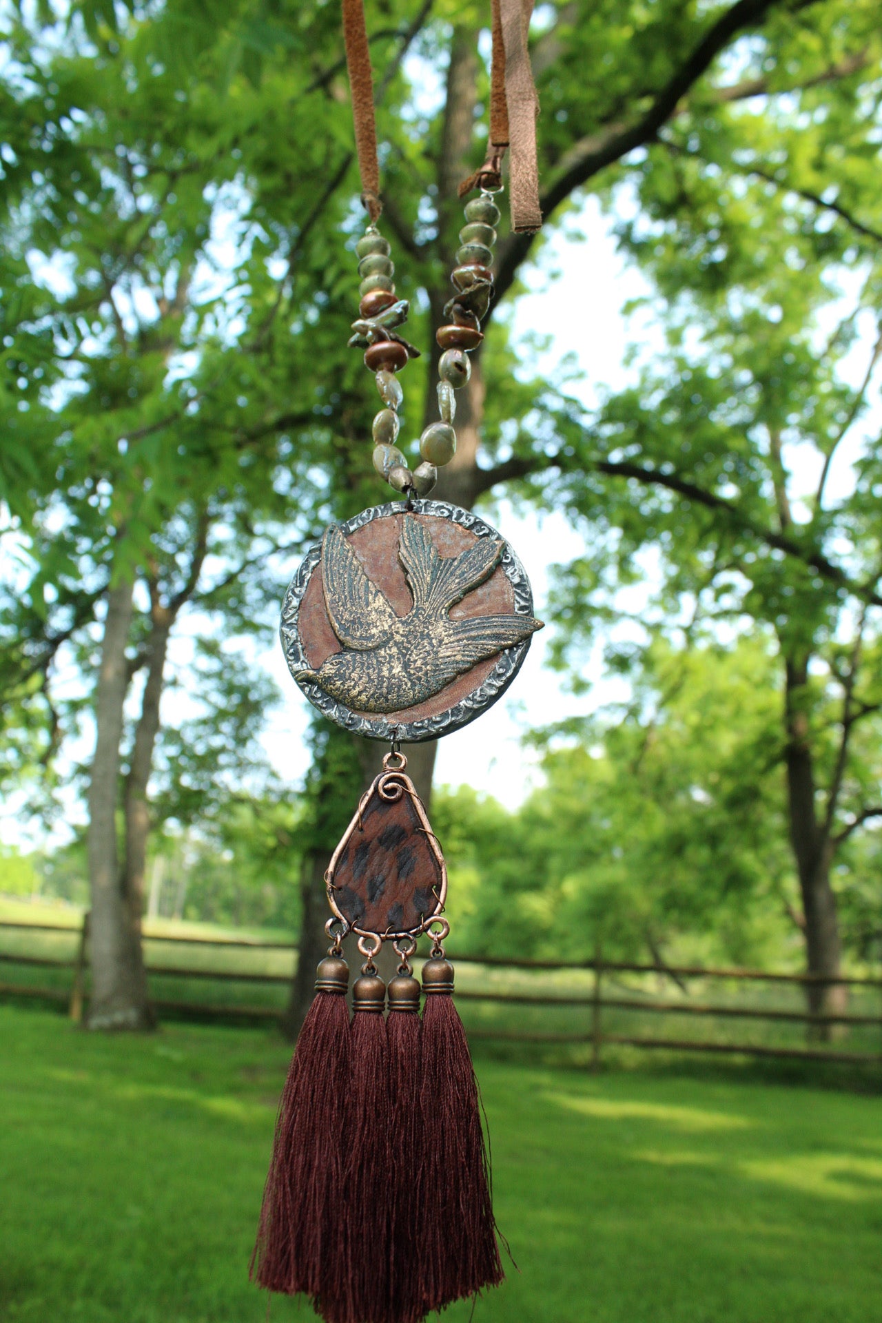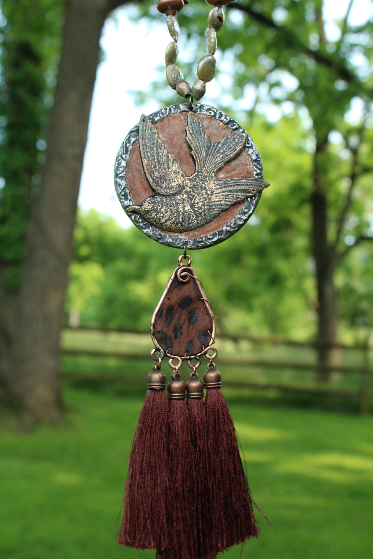 - Materials: Hand-sculpted pottery medallion with raised bird motif, silver-tone bezel, natural pearls, soft leather neckline, natural stone accent, burgundy textile tassels with antique brass caps