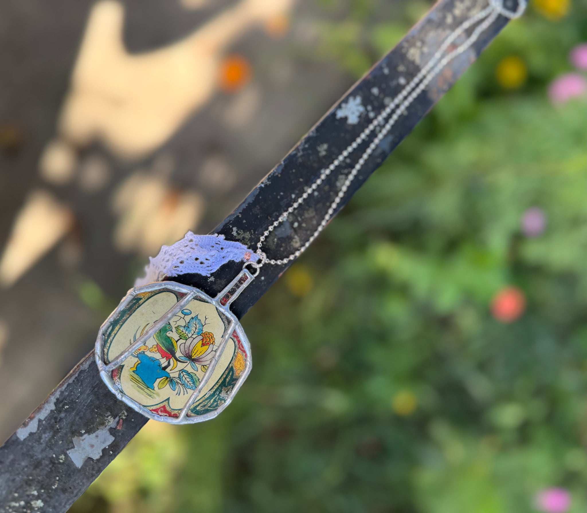 Hand cut vintage tin , one of a kind handmade soldered with genuine lleather tassels and a ball and chain necklace. Can change out pendant for any other necklace you have.