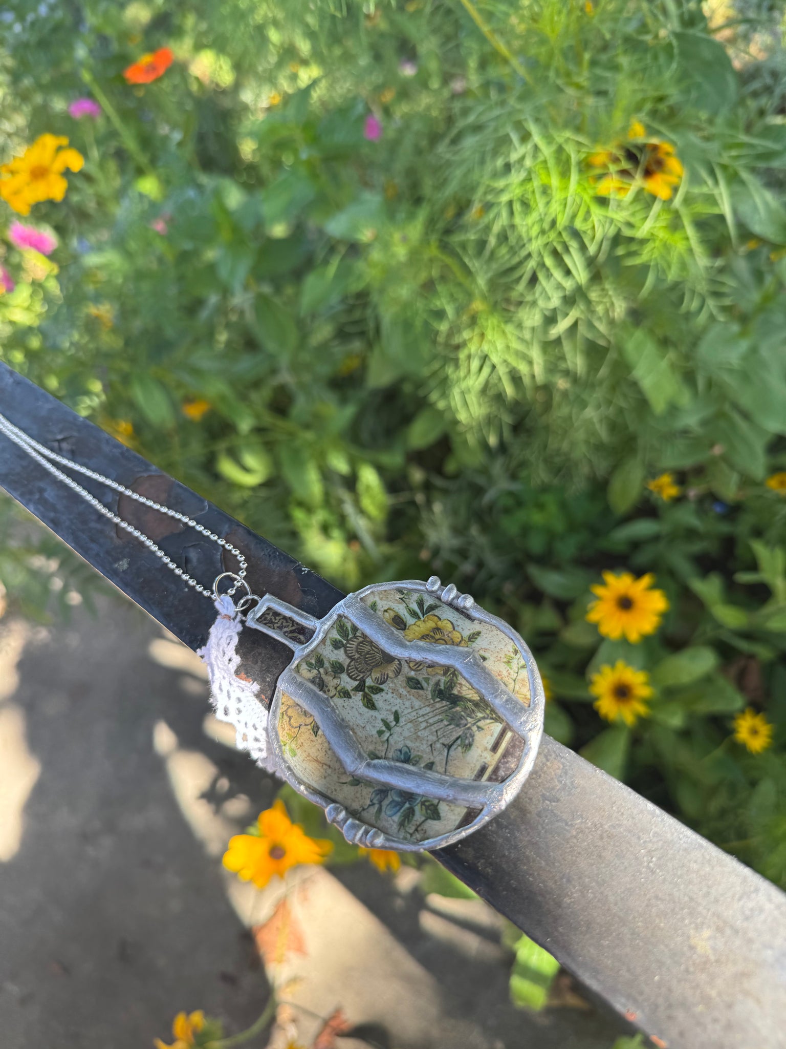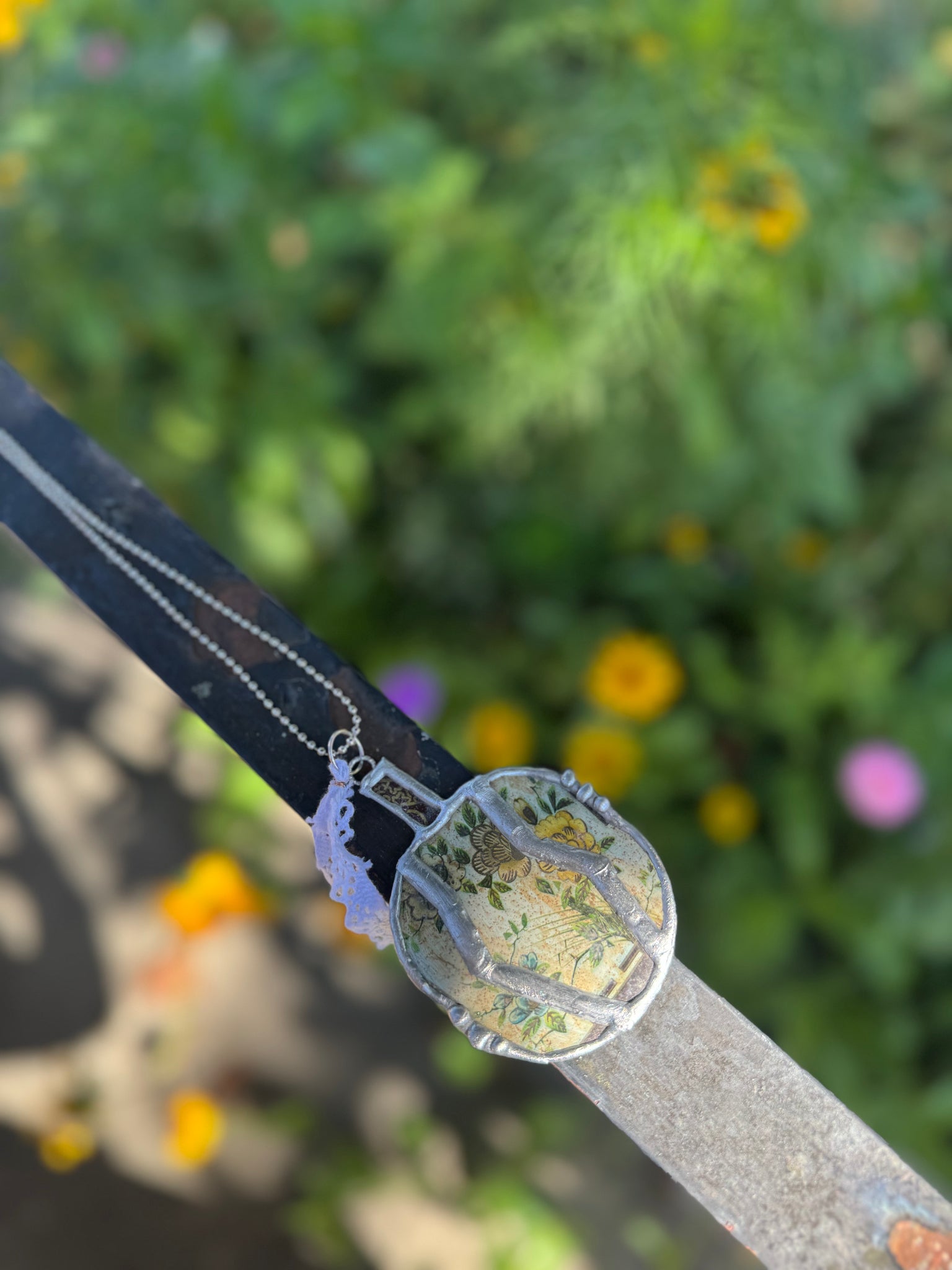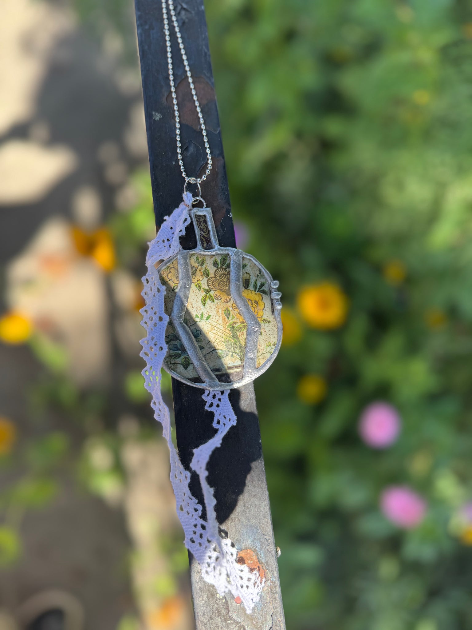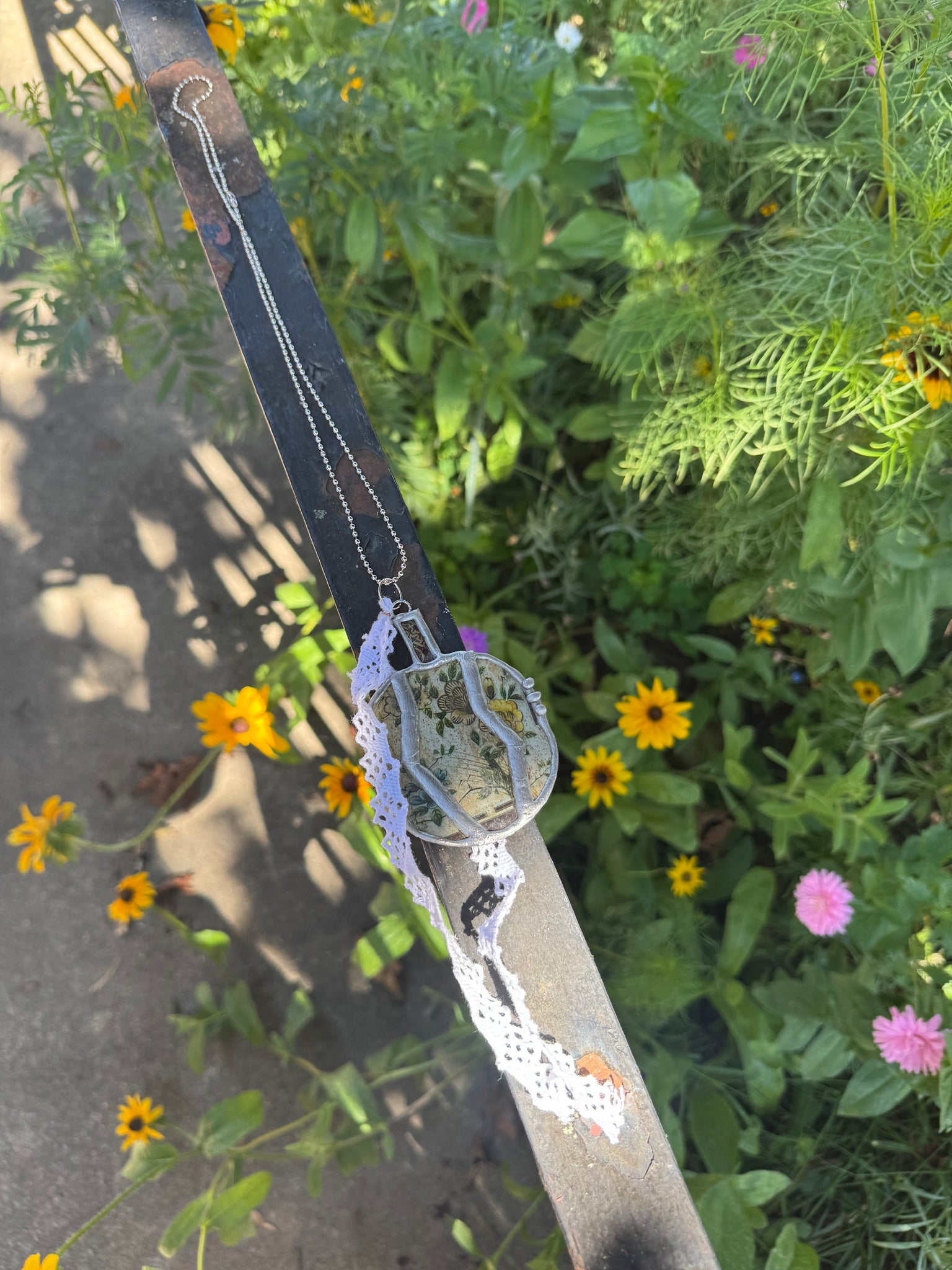 Hand cut vintage tin , one of a kind handmade soldered with genuine lleather  tassels and a ball and chain necklace. Can change out pendant for any other necklace you have.