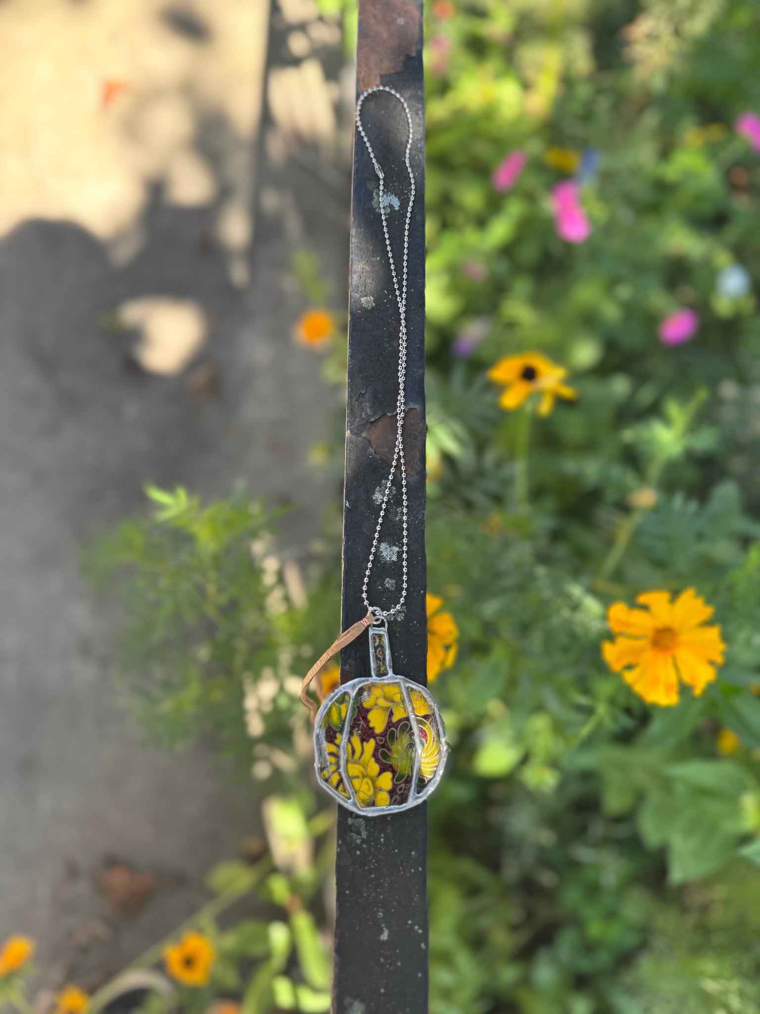 Hand cut vintage tin , one of a kind handmade soldered with genuine lleather tassels and a ball and chain necklace. Can change out pendant for any other necklace you have.