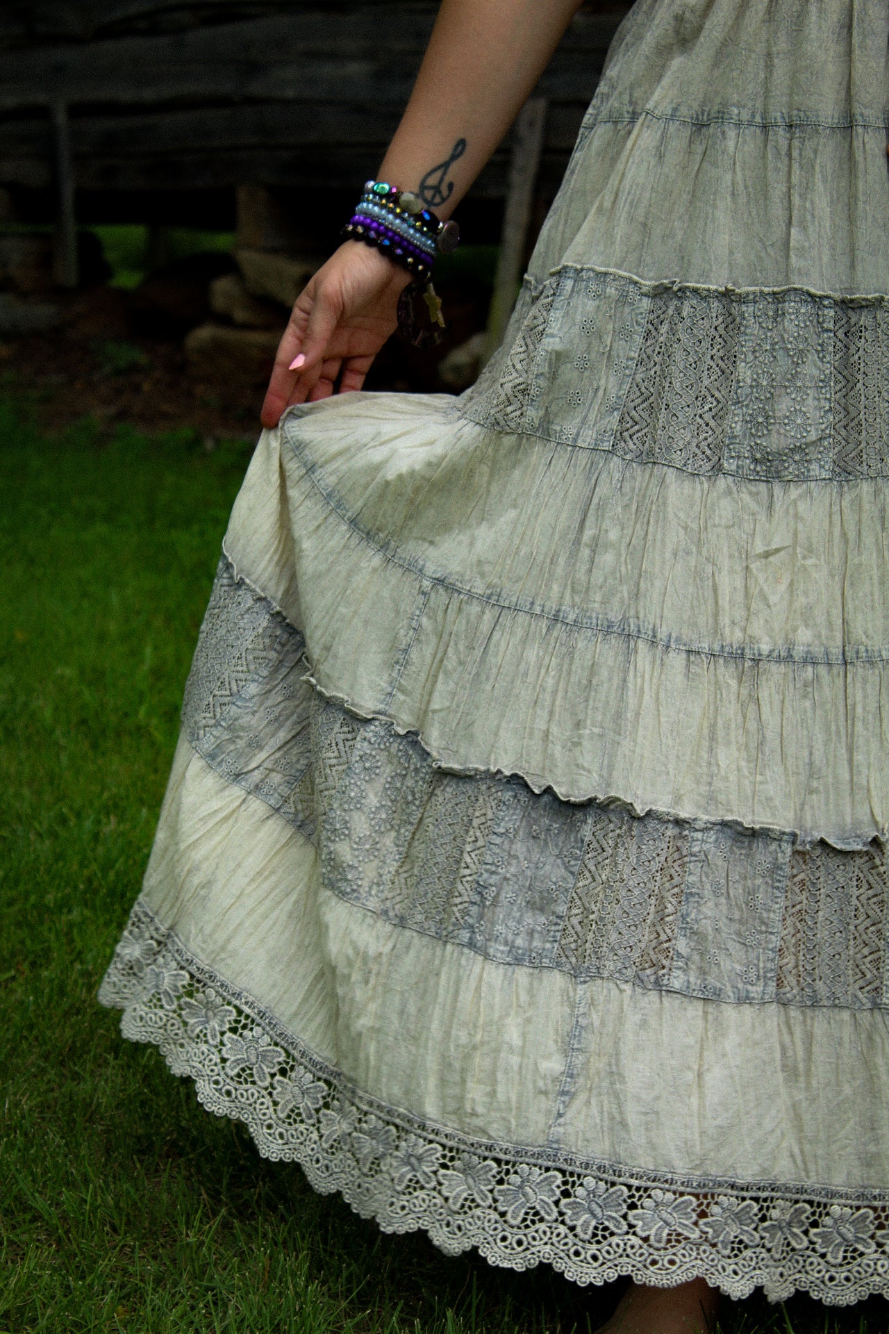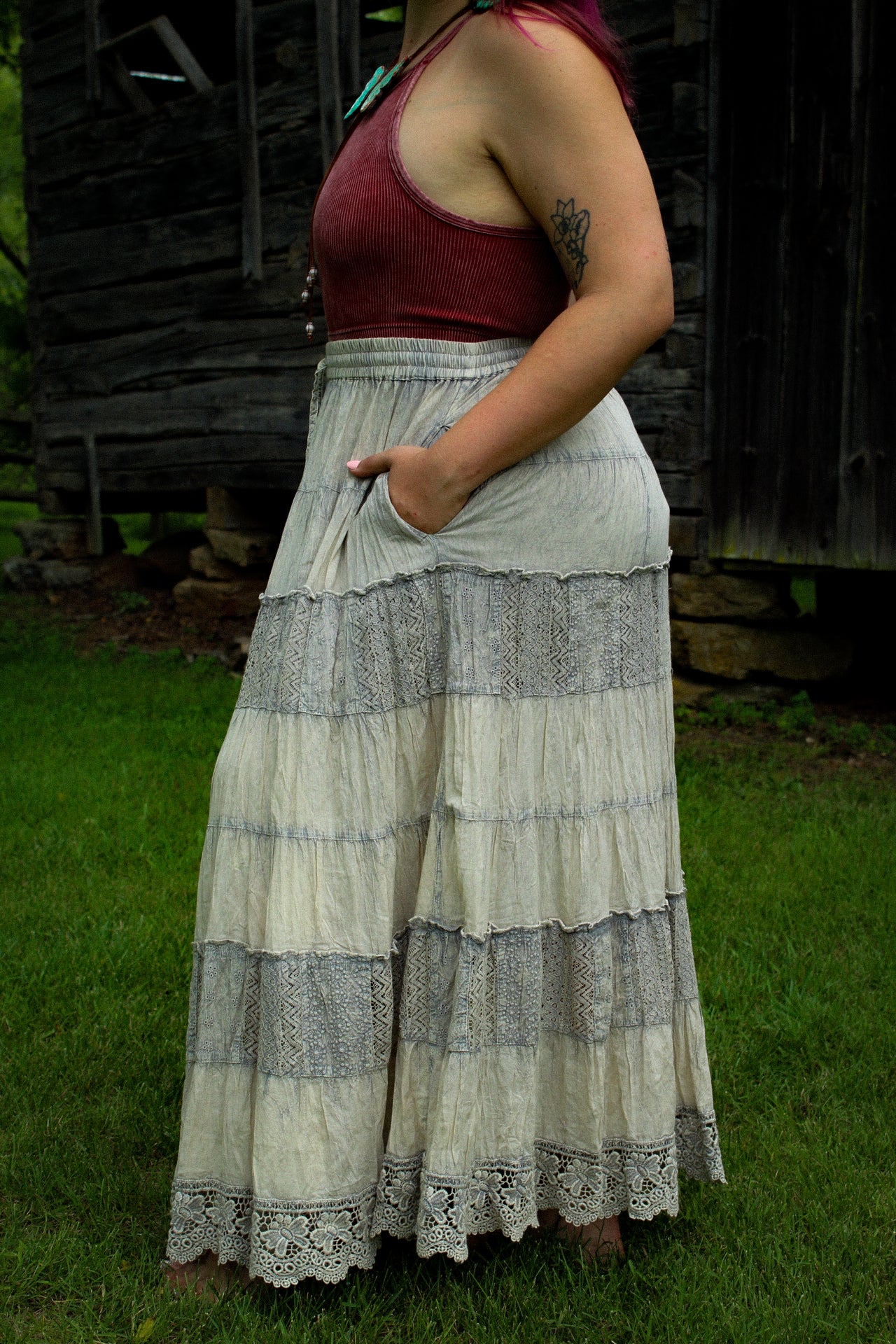 Style: 7-tiered crinkle skirt with lace and patchwork detailing, blending bohemian charm with practical design Material: Cotton and Lace